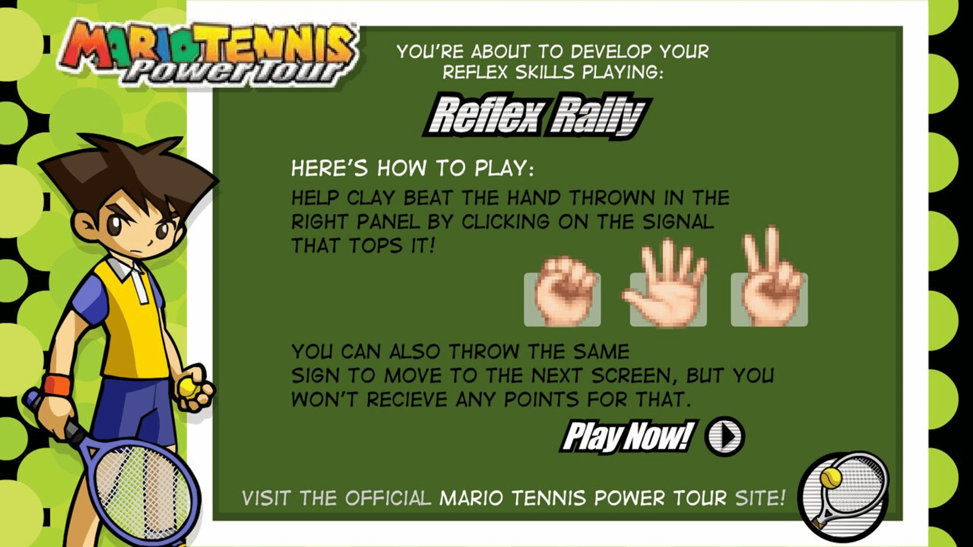 To promote Mario Tennis: Power Tour, the minigame was remade as an online Flash game that appeared under the name Mario Tennis: Power Tour -- Reflex Rally in the Nintendo Arcade, a section with promotional web games on Nintendo's official website. From a gameplay standpoint, there are no major differences between the two versions, although the timer in the Flash version starts counting from 30 instead of 60 seconds as in the original minigame. There is also no set score to beat, and the player always controls Clay.