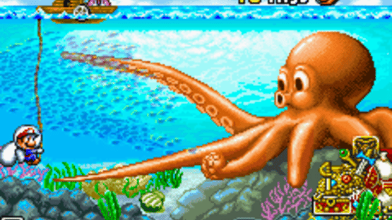 The gameplay in this version is largely the same, but the graphics are updated, and the divers are replaced by Mario down below and Princess Peach in the boat. In this version, Mario earns twice as many points for every piece of treasure he brings to Peach. However, Mario gets slower as he grabs more treasure. To counter this, he can throw all of his treasure, which lightens his load and can stun one of the Octopus's arms for a brief time. Sometimes the Octopus squirts clouds of black ink, and if one hits Mario, he receives a miss. When Mario amasses 200, 500, and 700 points, a Lakitu appears and drops a heart for him to remove a miss. The Modern version also features music, with the tempo changing depending on the speed of the game. In Game & Watch Gallery 4, the Octopus changes color each time the player gets 200 points. In Game & Watch Gallery 4, if the player selects the game yet does not actually start it, a humorous sequence is shown. Mario arrives with a bag of loot in one hand and a Game Boy Advance in another. However, he ends up surrounded by four octopus arms (two on each side) that are menacing him. Trapped, he then calls on a Lakitu to help him. He then grabs the fishing pole of the Lakitu and, trying to hold on, is ultimately forced to drop his belongings, with a crown and gold objects falling out of the loot bag. Finally, each octopus arm retrieves a treasure, including the loot bag itself as well as the GBA.