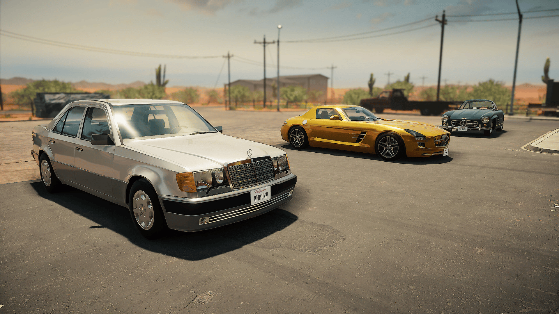 Mercedes-Benz Remastered includes 5 licensed Mercedes-Benz cars: Mercedes-Benz 300 SL Gullwing (W198), Mercedes-Benz 560 SEC (W126), Mercedes-Benz 500E (W124), Mercedes-Benz SLS AMG (C197), Mercedes-Benz 280 SL Pagoda (W113).