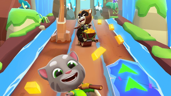 Run fast through the Magic Gate! Tom, Angela, Hank, Ben, Ginger and Becca dash into an awesome adventure together! Talking Tom Time Rush is the all-new runner game! Tom and friends have found a Magic Gate but the Rakoonz crash the fun. They steal the Crystals and escape into a fantastic world! Players join Tom and friends as they jump into wonderful worlds, explore unique side paths and discover special surprises together. It’s an epic chase after those rascal Rakoonz to recover the Crystals!