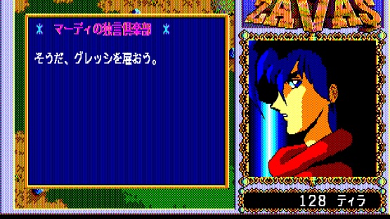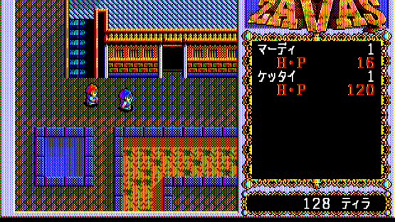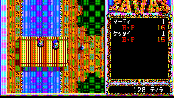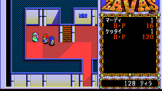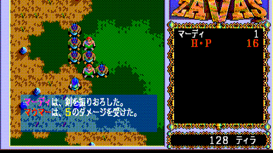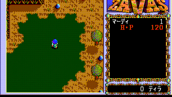 Described by its developers as a "New Type Role-Playing Game", Zavas differs from the Japanese-made RPGs by resembling a Western-style RPG, in particular the Ultima games of its time. Retaining the characteristically Japanese manga/anime aesthetics in graphics, Zavas has little resemblance to Japanese RPGs in other aspects. It is not story- and character-driven; the player controls a knight named Mardy in the medieval fantasy land of Fargana (with slight Middle Eastern influences), and is free to go anywhere, exploring the world without following a set storyline. The top-down world consists of vast wilderness areas and towns. Similarity to Western RPGs is evident in detailed management of player-controlled party (NPCs with names and portraits, but little personality can be found and recruited). beside the usual weapon, armor, and item management, the player must also buy food to keep his characters alive. Some of the interaction with NPCs offers choices (for example, paying money or attacking a guard who demands toll to enter a city). The enemies appear randomly. The turn-based combat is very similar to that of Ultima games, with characters freely moving around a fixed battle screen.