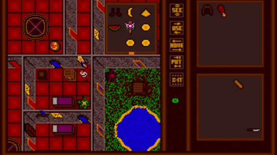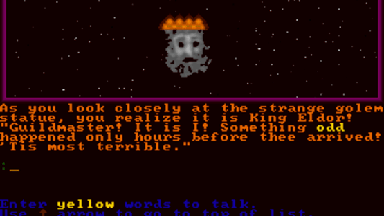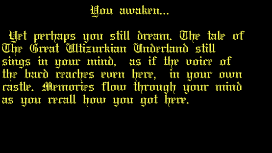 Ultizurk III: The Guildmaster's Quest is a shareware top-down fantasy role-playing game that is visually similar to Ultima VI. As the eponymous Guildmaster, the player must save the kingdom from a mysterious threat. The player controls a party of two: the Guildmaster and his companion Losi from the previous adventure in The Great Ultizurkian Underland. Basic interaction with the game world is accomplished by using the mouse, talking to NPCs requires the player to type keywords highlighted in yellow. The game boasts a great degree of interactivity, with the player being able to manipulate most items in a way they would behave in real life (e.g. fill a bucket with water and then put a burning torch out with it).
