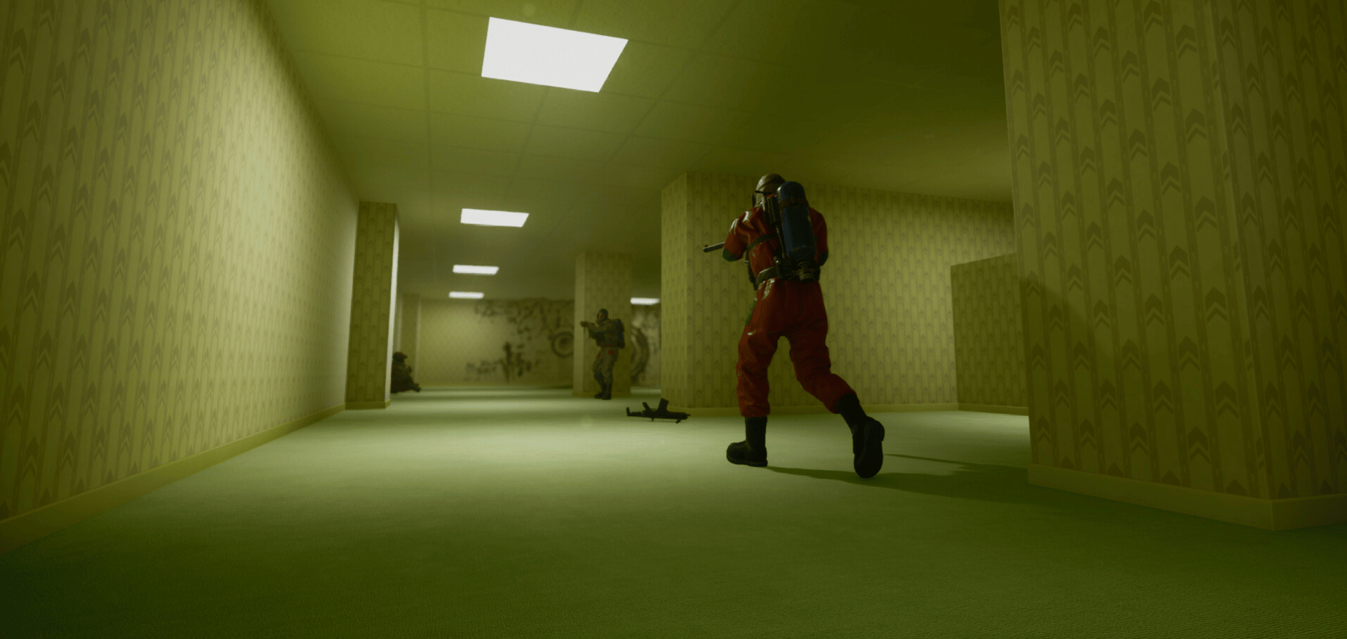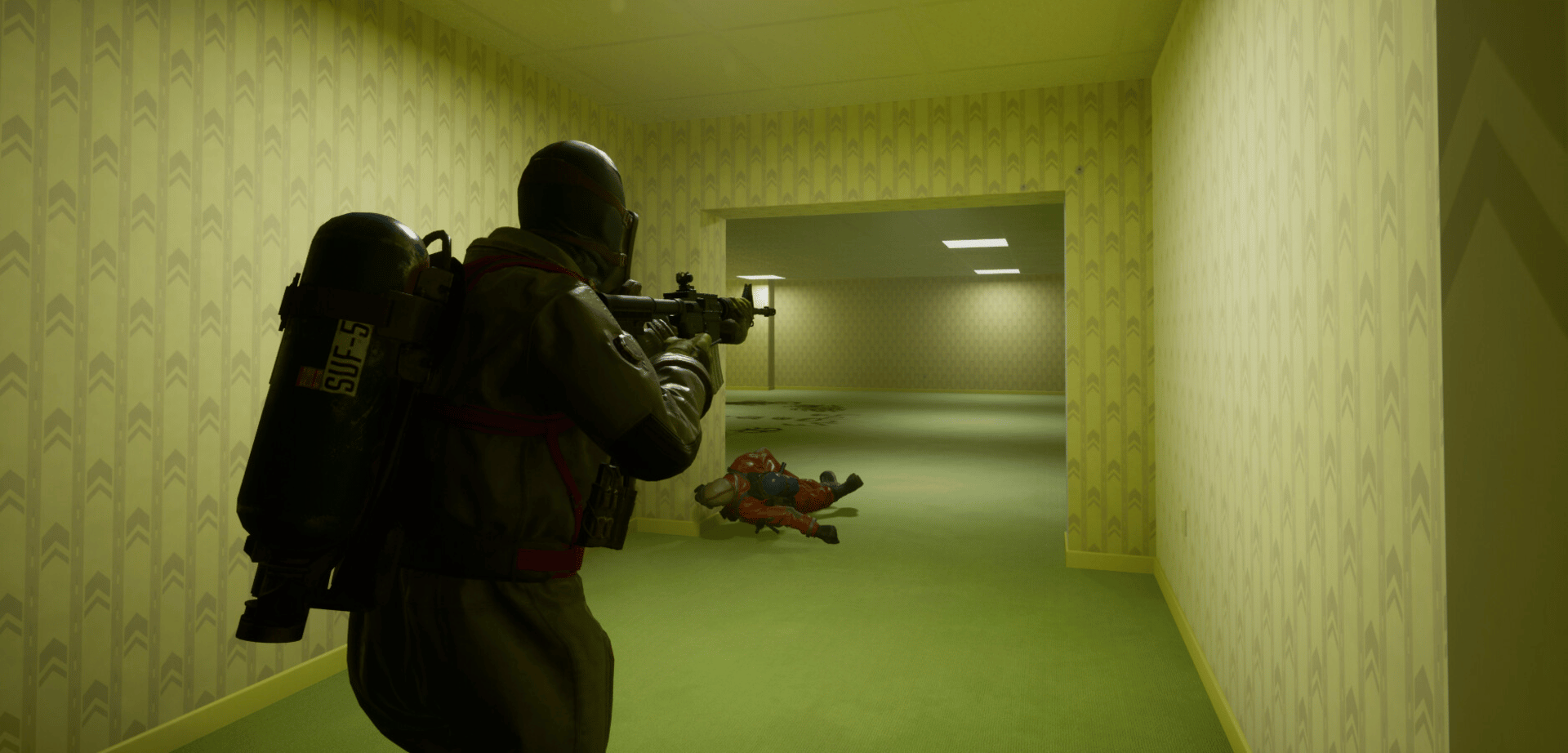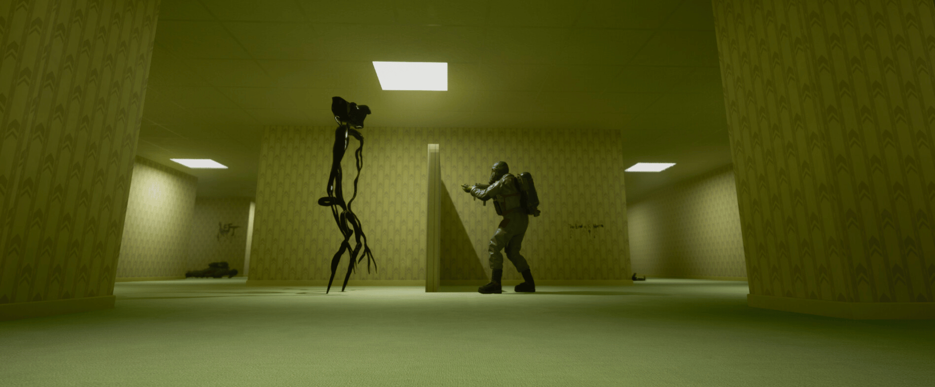 Fight for survival in the Backrooms. Play with friends in multiplayer or solo against AI bots. Unearth the terrifying monster scorestreak and get ready for an intense experience!