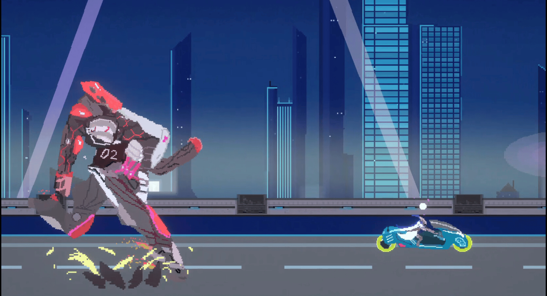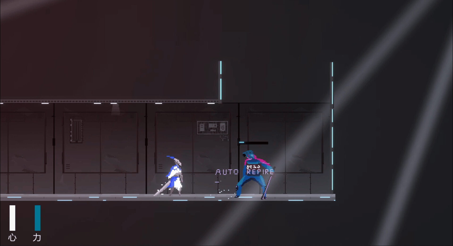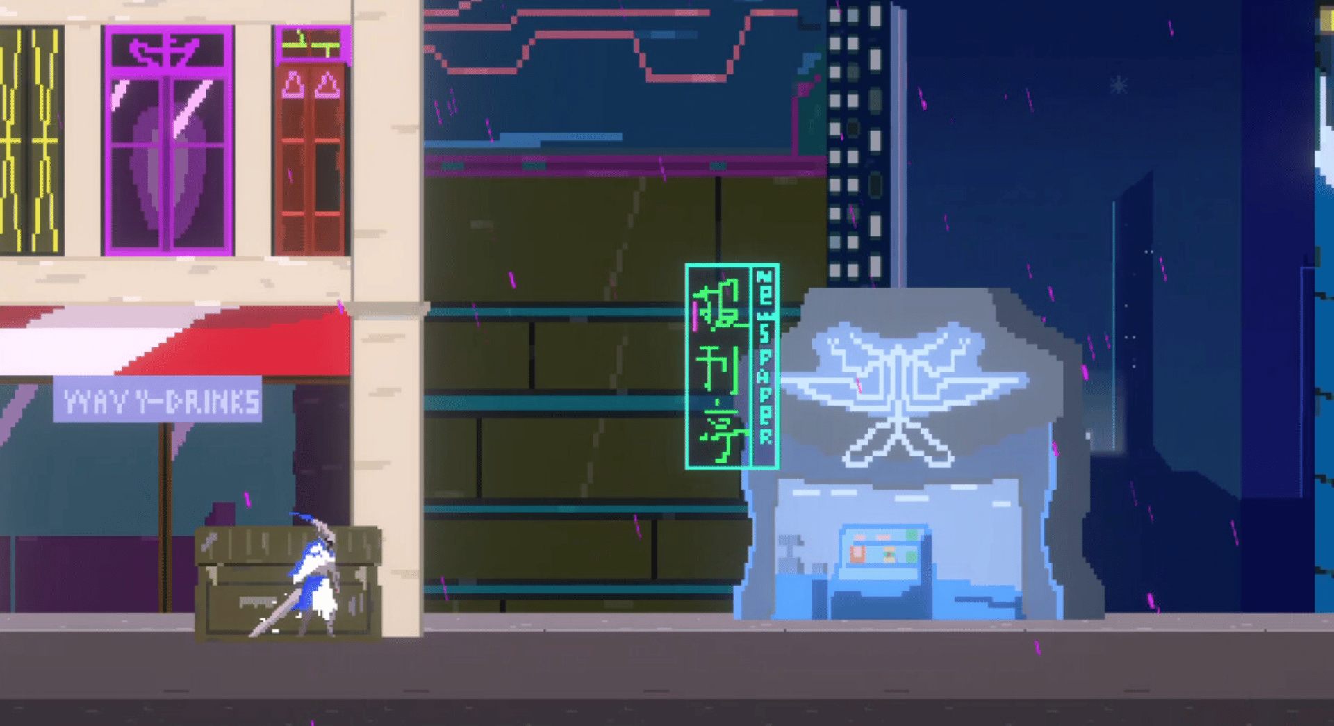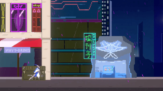 A indie 2d hack and slash pixel art game with a cyberpunk vibe and focus on sword clinging combat