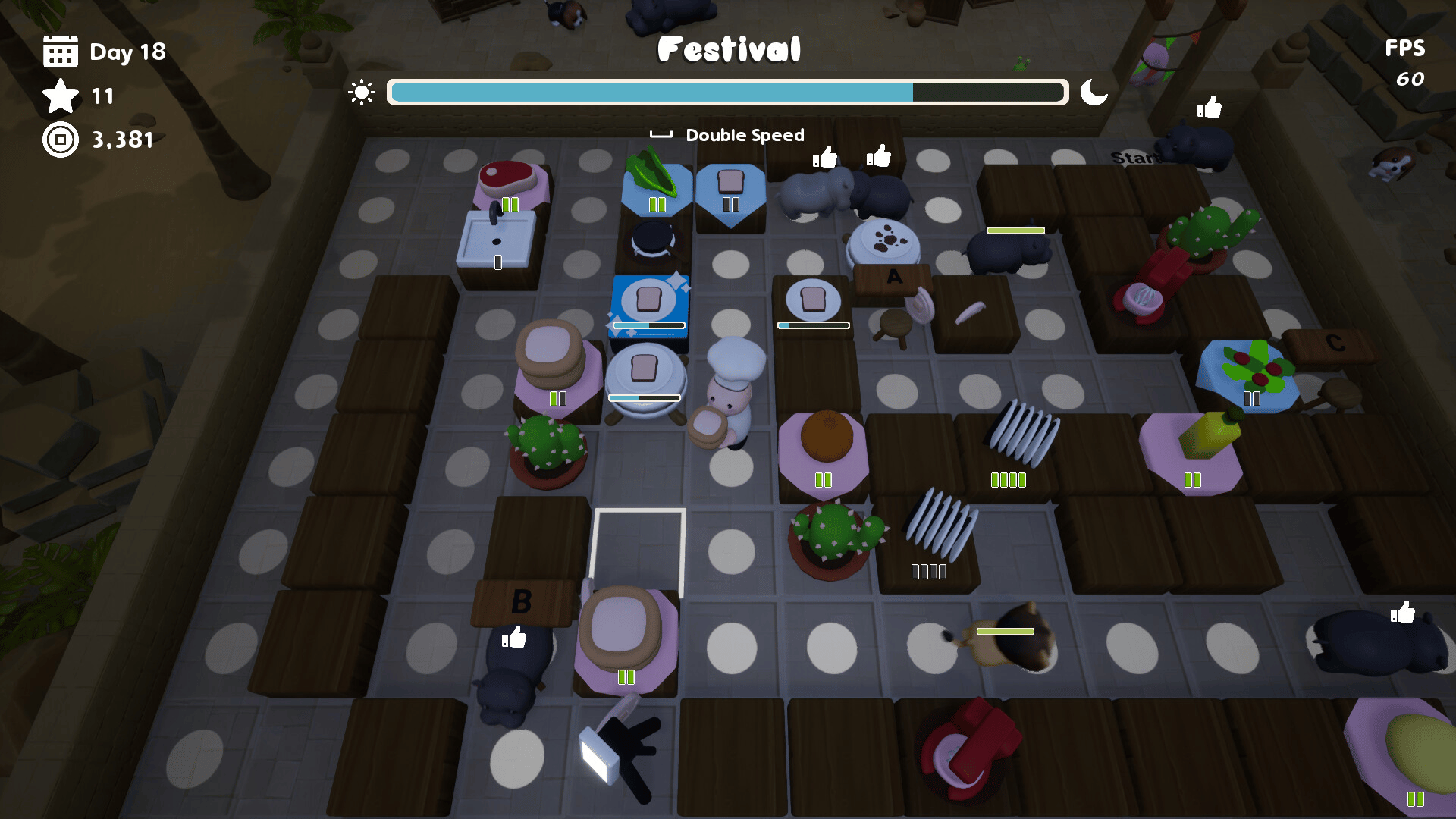 Create and design your own complex maze by strategizing your festival spaces! Cook and serve dishes to satisfy your customers. Level up to unlock to new ingredients and recipes. With unexpected roguelite elements and fast-paced gameplay, you can play solo or in chaotic co-op with your fellow chef!