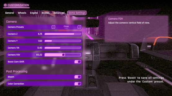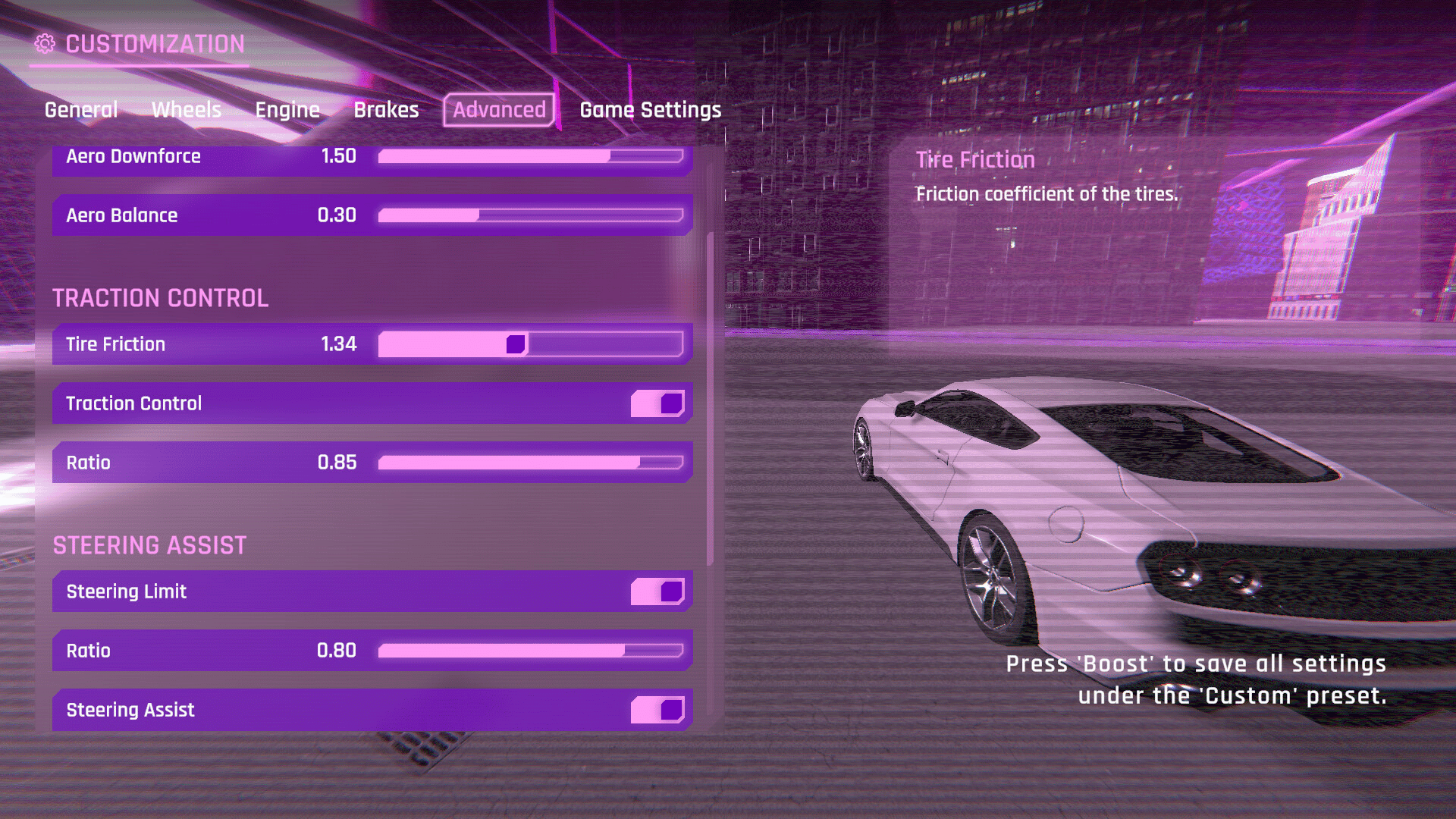 Drive around Synthwave City's open world while completing challenges to unlock new cars. Fully customize every detail of how your car drives or choose from a list of presets. Listen to synthwave, retro, vaporwave tracks and hit the notes to build your boost and pull off some impressive maneuvers!