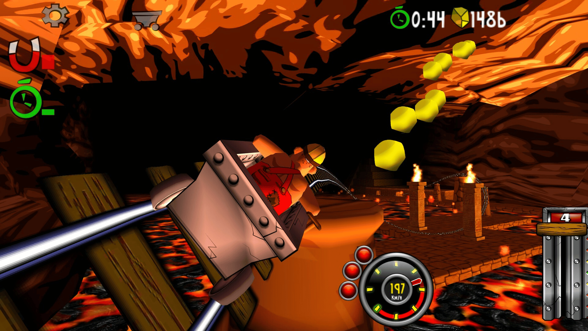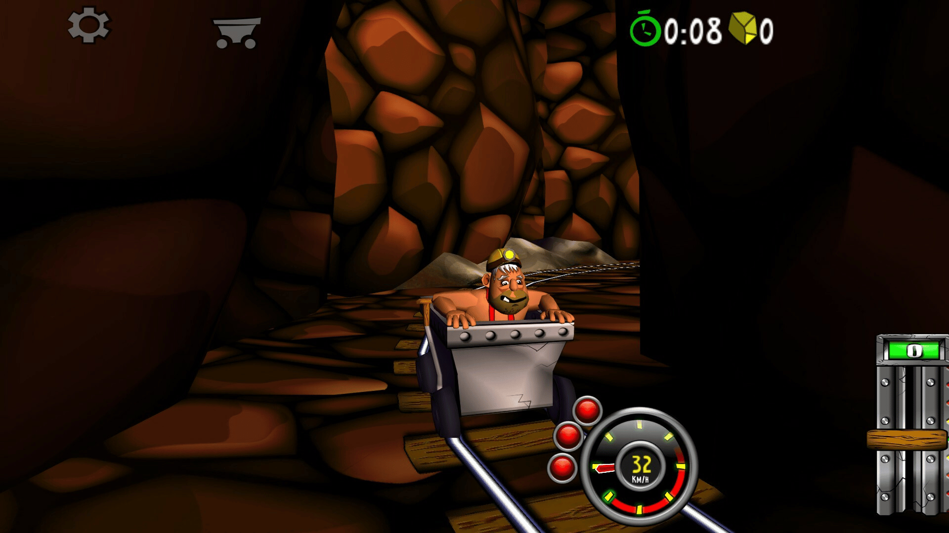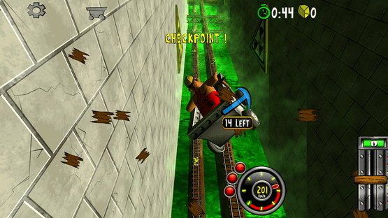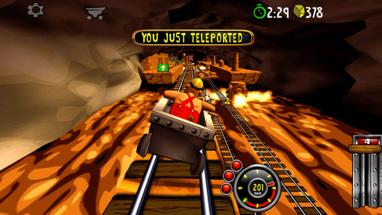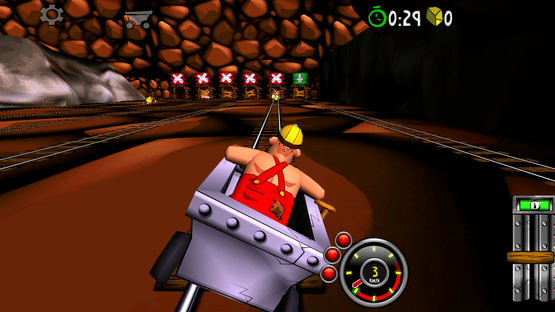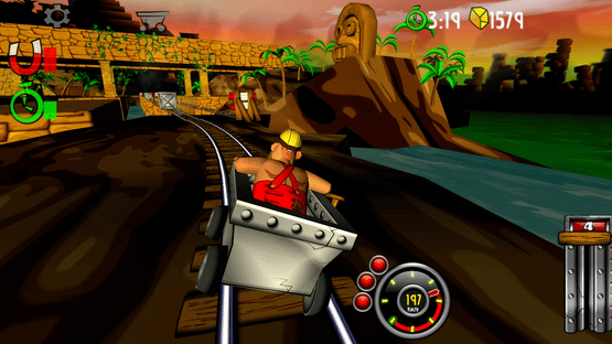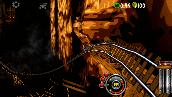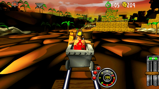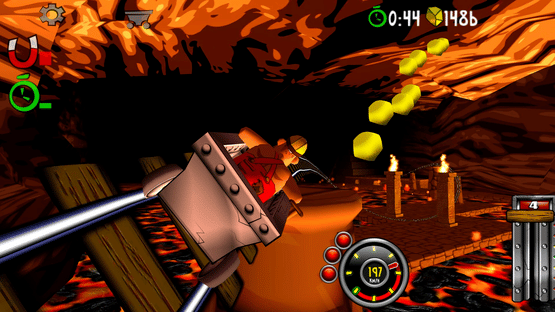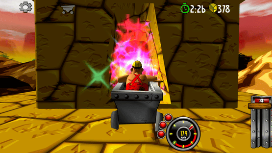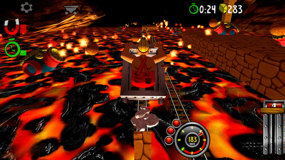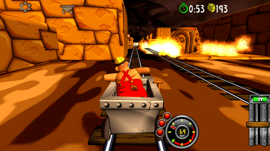 Blast with amazing speed through mines and caves. Break through wood, stone- and steel. Evade flowing lava, falling rocks and hazardous machinery. Race, jump, fly with amazing speed across rivers and ravines. Looping, doors, saws, fire, high voltage, rocks, traps and more.