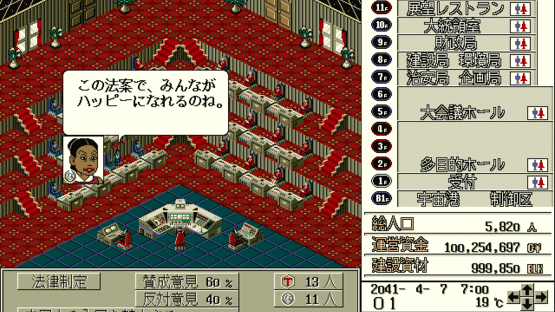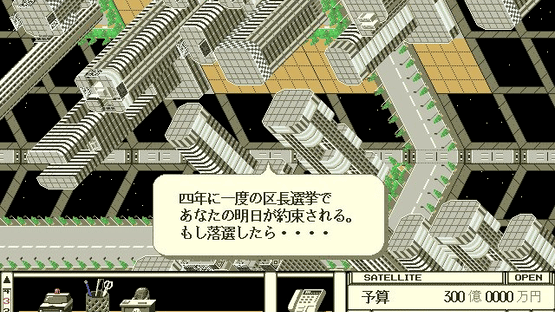 Tokio: Tokyo-to Dai 24-ku of Tokyo is a sci-fi city simulator from Artdink, the company behind the A-Train economy sim series. Playing it will require careful planning, improvisation, and correspondence with your city's constituents to fix problems and make everyone happy. You can personally telephone residents to hear their opinions, or even tune in on various TV channels to survey Tokio. Every little counts: your political party platform, the techno-industrial automation needed to power Tokio & its economy, and even space tourism via space shuttles and other programs—among others! Elements like artificial gravity, weather control, and orbital mining can also make or break your term as mayor, so manage it all to the best of your ability.