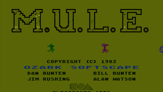 M.U.L.E. is about four hopeful explorers trying to make a fortune on a virgin planet. This is done by producing various goods (Food, Energy, Smithore, Crystite). Each of these goods have their uses: if you don't have enough food, you will have less time during your turn. If you don't have enough energy, your output will be lower. If enough smithore isn't produced, there will be a shortage of M.U.L.E.s. Crystite is the big earner that can make or break your game. You start the game by selecting your race. Some are easier to play, some harder. There are three levels of difficulty, in the easiest the game only lasts 6 turns, but the real game is 12 turns. Crystite is not available at the easiest level. Each turn starts with land claim. Each player gets to choose a spot of land for themselves from the map. If two players choose the same spot, the player with less money wins. The map consists of different landscape. River is best for producing food, plains for energy, mountains for smithore. Crystite is hidden and must be first found by taking a land sample to the town. After the land claim each player takes turns in cultivating their land and do other tasks. They can buy M.U.L.E.s to start production on their land, sabotage other players by buying M.U.L.E.s and letting them loose, try to catch the Wumpus for cash and try to find crystite veins. The time to do these things depends on if the player has enough food. Finally the player goes to the casino and wins a small amount of money, depending on how much time was left.