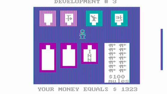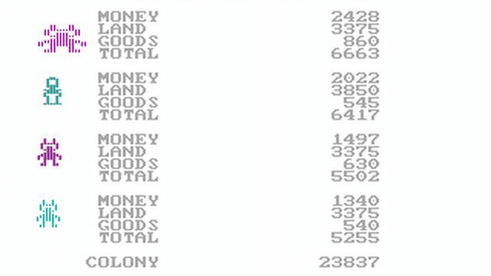 M.U.L.E. is about four hopeful explorers trying to make a fortune on a virgin planet. This is done by producing various goods (Food, Energy, Smithore, Crystite). Each of these goods have their uses: if you don't have enough food, you will have less time during your turn. If you don't have enough energy, your output will be lower. If enough smithore isn't produced, there will be a shortage of M.U.L.E.s. Crystite is the big earner that can make or break your game. You start the game by selecting your race. Some are easier to play, some harder. There are three levels of difficulty, in the easiest the game only lasts 6 turns, but the real game is 12 turns. Crystite is not available at the easiest level. Each turn starts with land claim. Each player gets to choose a spot of land for themselves from the map. If two players choose the same spot, the player with less money wins. The map consists of different landscape. River is best for producing food, plains for energy, mountains for smithore. Crystite is hidden and must be first found by taking a land sample to the town. After the land claim each player takes turns in cultivating their land and do other tasks. They can buy M.U.L.E.s to start production on their land, sabotage other players by buying M.U.L.E.s and letting them loose, try to catch the Wumpus for cash and try to find crystite veins. The time to do these things depends on if the player has enough food. Finally the player goes to the casino and wins a small amount of money, depending on how much time was left.