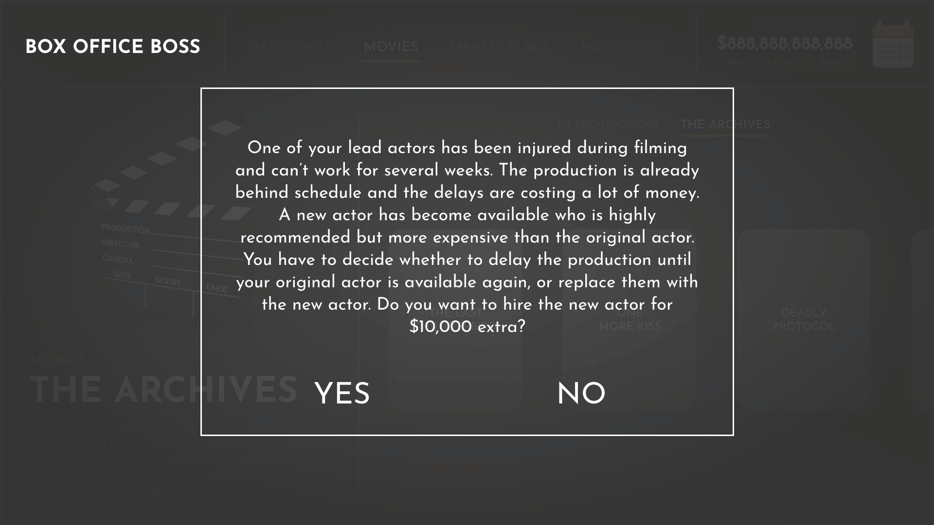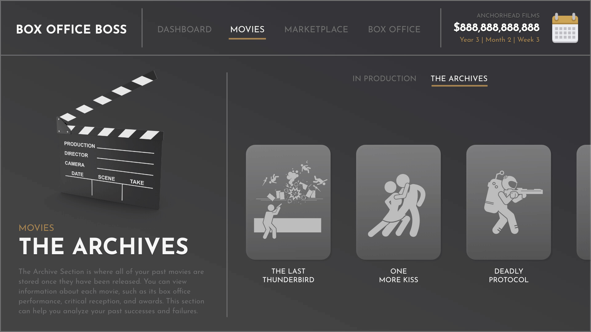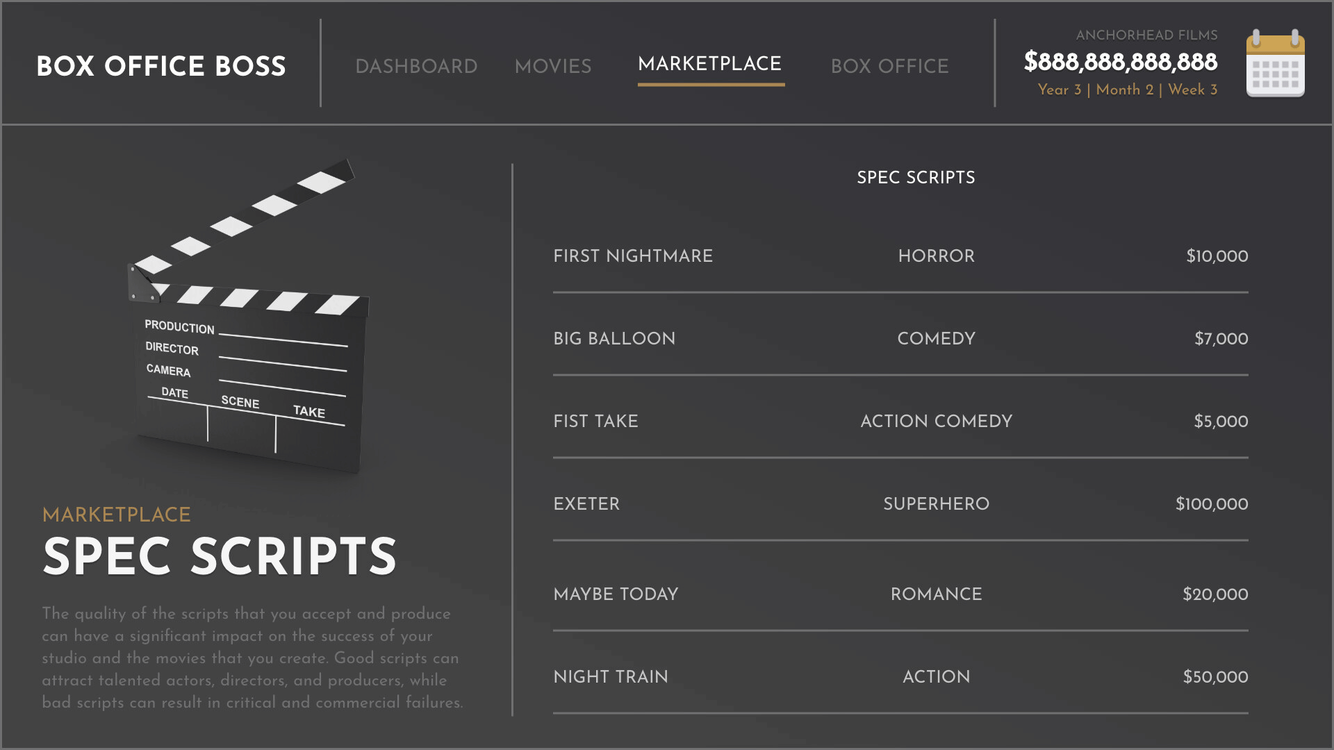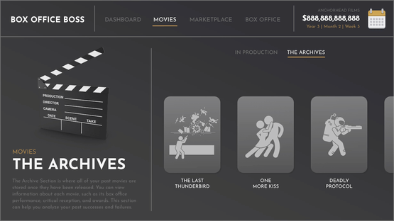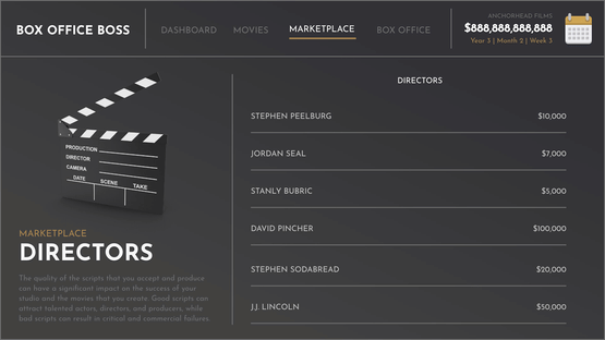 Box Office Boss puts you in charge of your own movie studio. The studio will rise or fall on the back of your executive decisions. Everybody thinks they could make a good movie, but do you have what it takes to turn that dream into box office success?