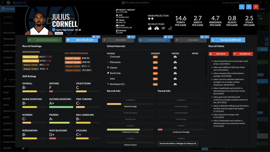 Draft Day Sports: College Basketball 2023 puts you in the role of head coach of your favorite college basketball team. Every decision can be made by you from staff hiring, recruiting, scouting and all the way to making each substitution to lead your team to tournament glory and becoming a dynasty.
