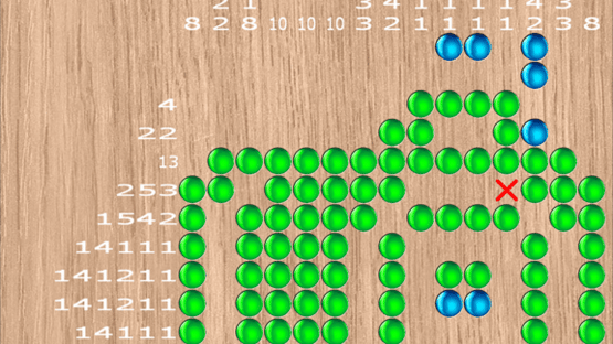 Your aim in these puzzles is to colour the whole grid in to red ball and clear blue ball. At the top of each column, and at the side of each row, you will notice a set of one or more numbers. These numbers tell you the runs of red balls in that row/column. So, if you see '10 1', that tells you that there will be a run of exactly 10 red balls, followed by one or more blank cell, followed by a single red ball. There may be more red balls before/after this sequence.
