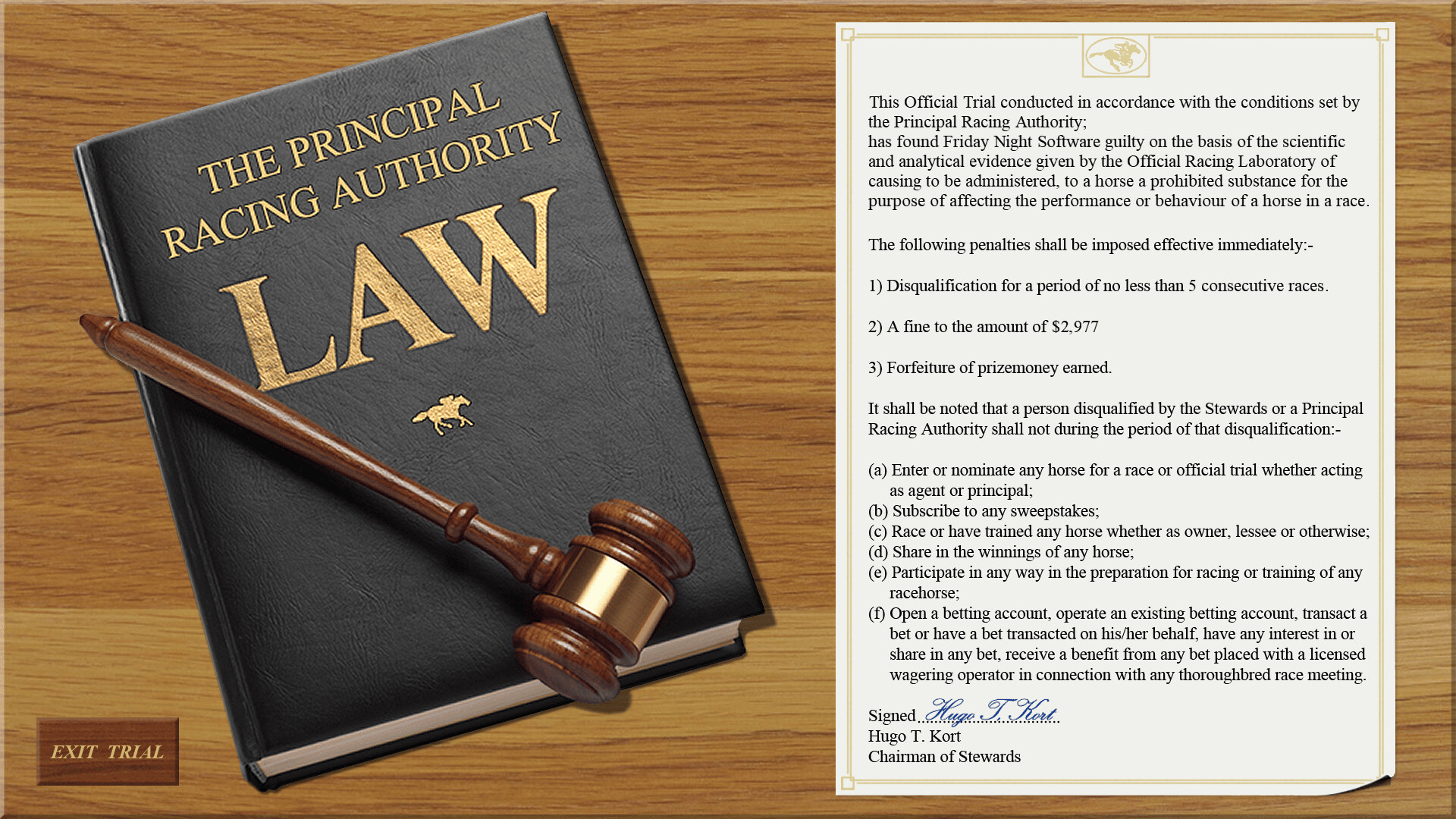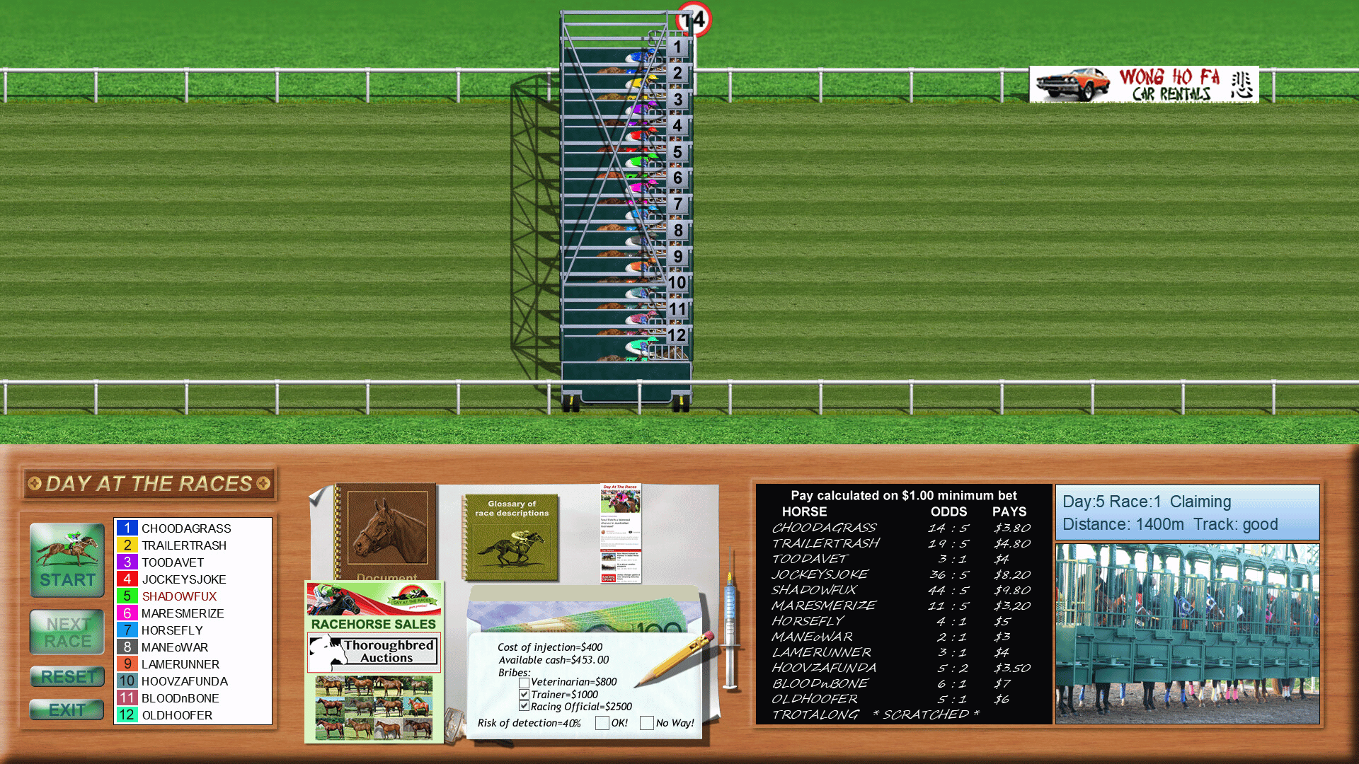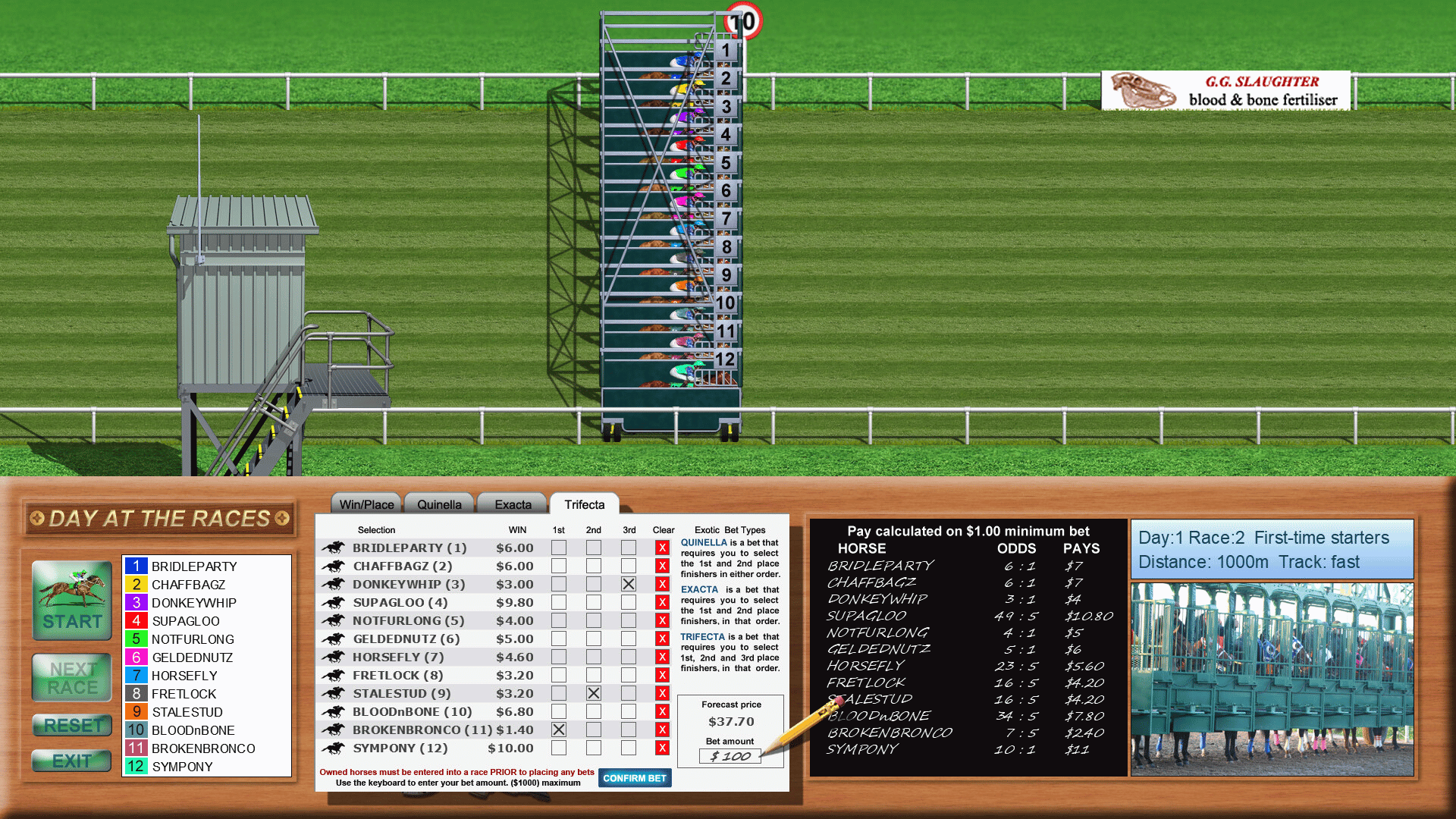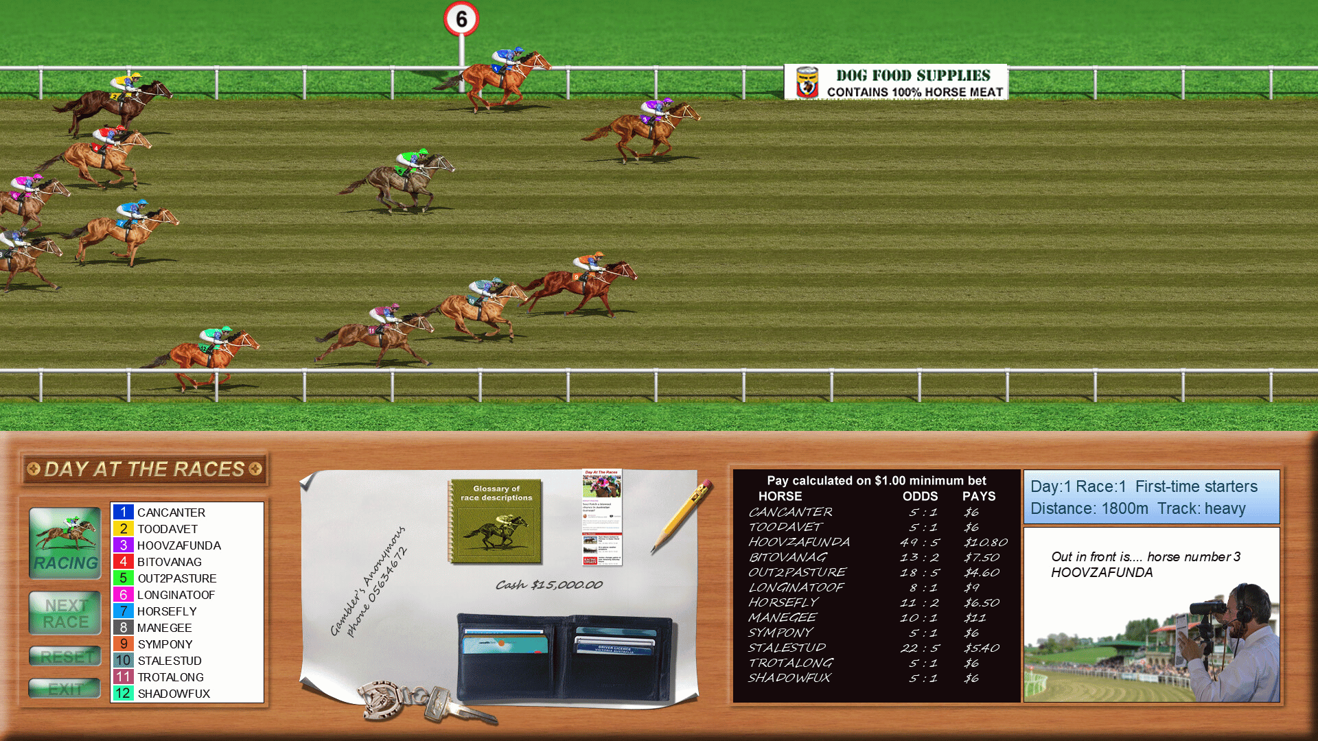 The aim of this "light-hearted" horse racing game is to win enough money to purchase, maintain and enter your horse in the prestigious Day at the Races Cup, held on the 5th race of the final day. Good luck!