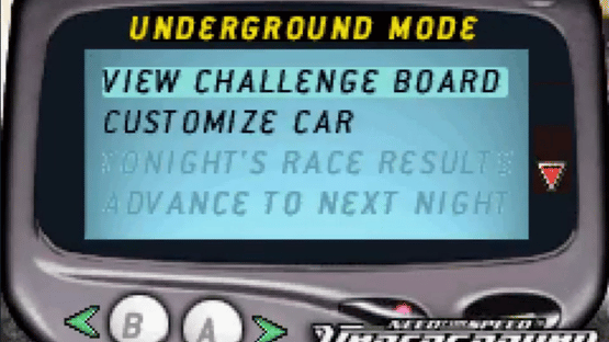 Need for Speed Underground for the GBA is based upon the same gritty dark-side-of-racing design released on the consoles. Here, players have the opportunity to challenge racers to different styles of driving in order to earn coin that can be spent on upgrades; the GBA game features a garage of fourteen different licensed vehicles from Ford, Toyota, Volkswagen, Nissan, Mazda, Mitsubishi, Subaru and Acura, and each of these cars can be customized with paint, bumpers, decals, rims, ground effects, and more. The further into the Underground you go, the more extras you can unlock in order to create the most tricked out road machine the streets have ever seen. Most of the races are the traditional kind, with players racing against as many as three other opponents in the competition. There are also Drag challenges where racers will have to blast their way down a stretch of road, and Drift challenges where players score points by powersliding around the curves. Every win awards a dollar amount which can be converted into extras for the vehicle...either for performance or cosmetic purposes.
