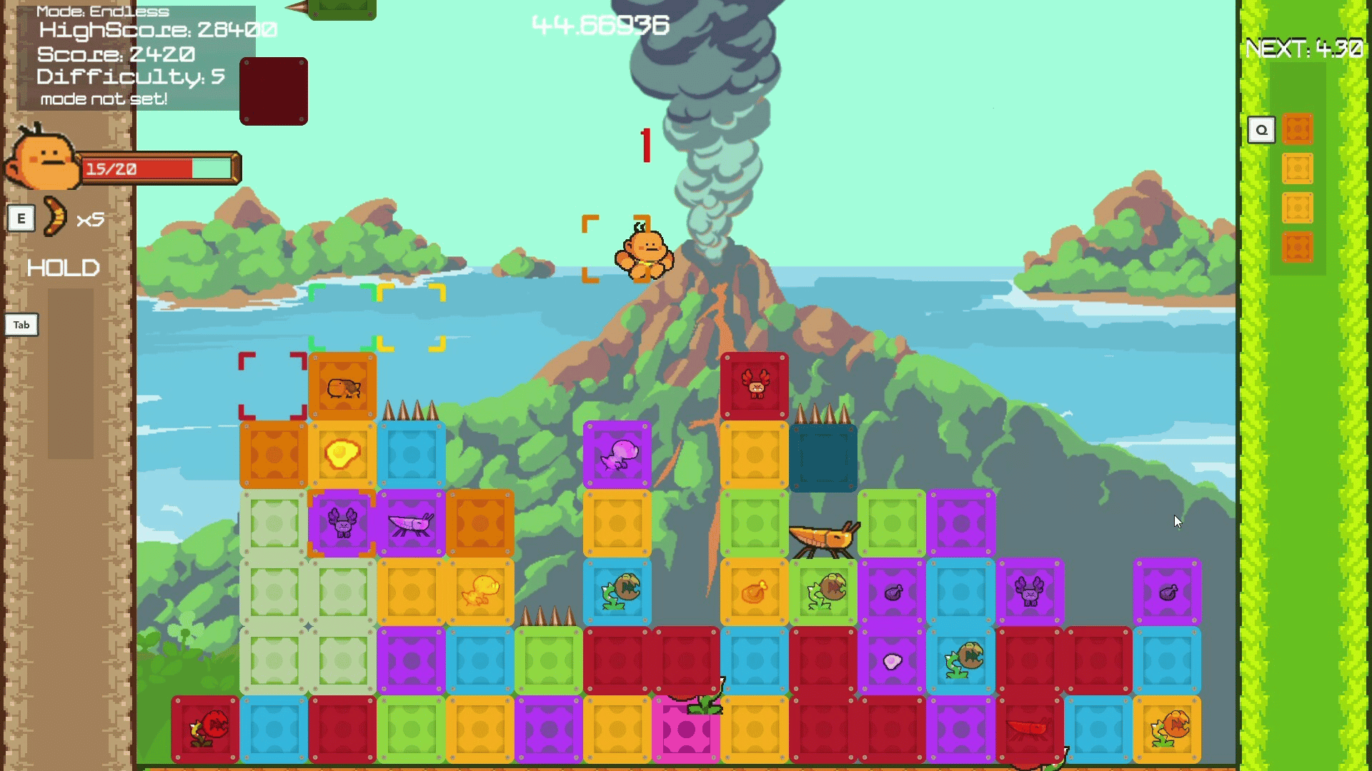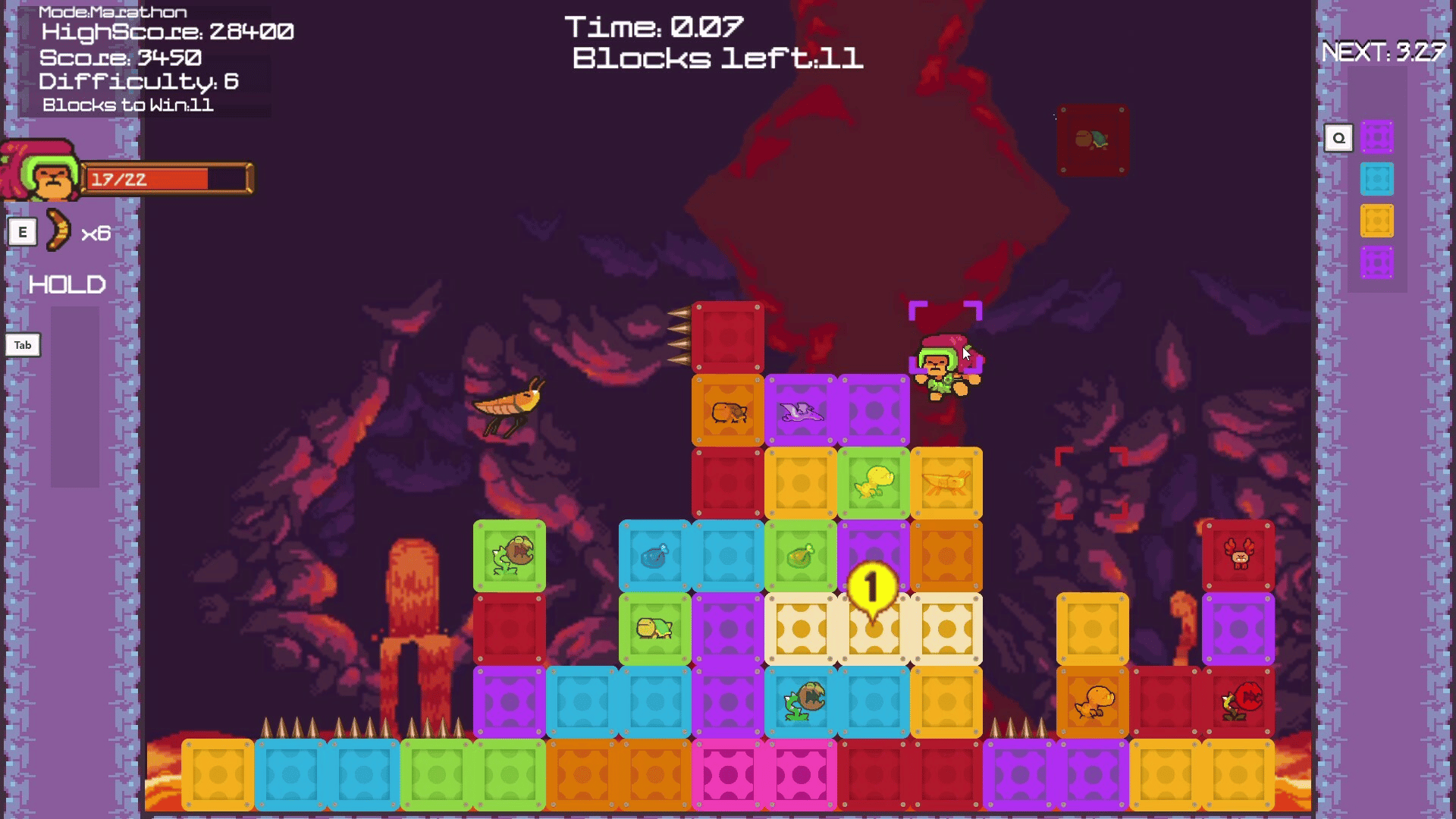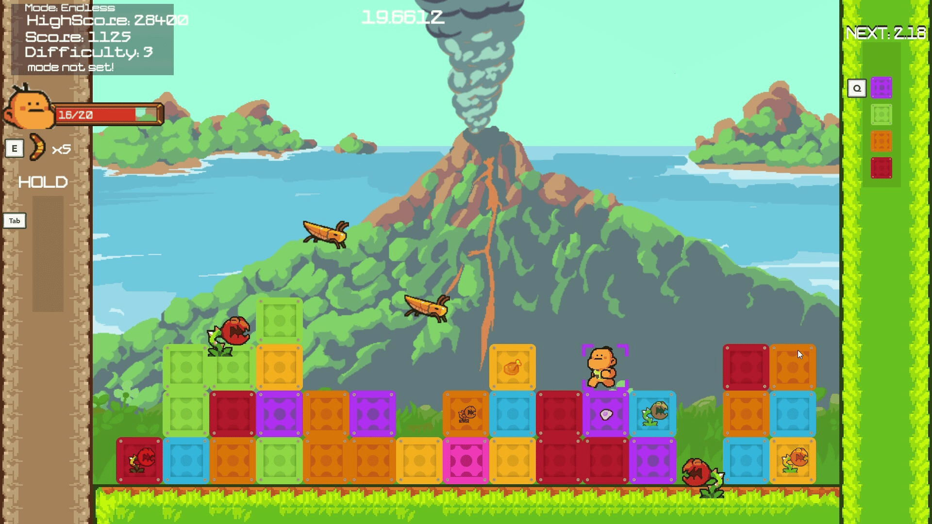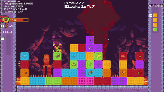 Puzzle Panic Island is a fast paced, skill-based match 3 Puzzle Platformer. You Control a character who must survive the Puzzle Blocks falling on their head and then Match them up, while also avoiding the Hazards they carry within! (Mostly Dinosaurs.)