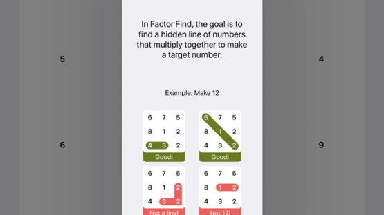 Inspired by the classic Word Search and Sudoku games, Factor Find is a puzzle game about math! The rules are simple: solve puzzles by making target numbers with factors on the board. For example, make 12 from 4*3 or 2*6. Factor Find is more strategic than it initially appears. With the right strategy, it's possible to solve even the most complicated puzzles without doing complicated math! Calculators might be better than people at simple arithmetic, but they could never solve a Factor Find puzzle!