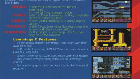 This port of Lemmings 2 sees the graphics stay mostly the same, with only some slight downgrades in quality and performance due to the less powerful hardware. Matt Furniss composed the new music which is just the original music rescored for the Genesis, and sounds substantially different due to the different soundcards and lesser sampling support.