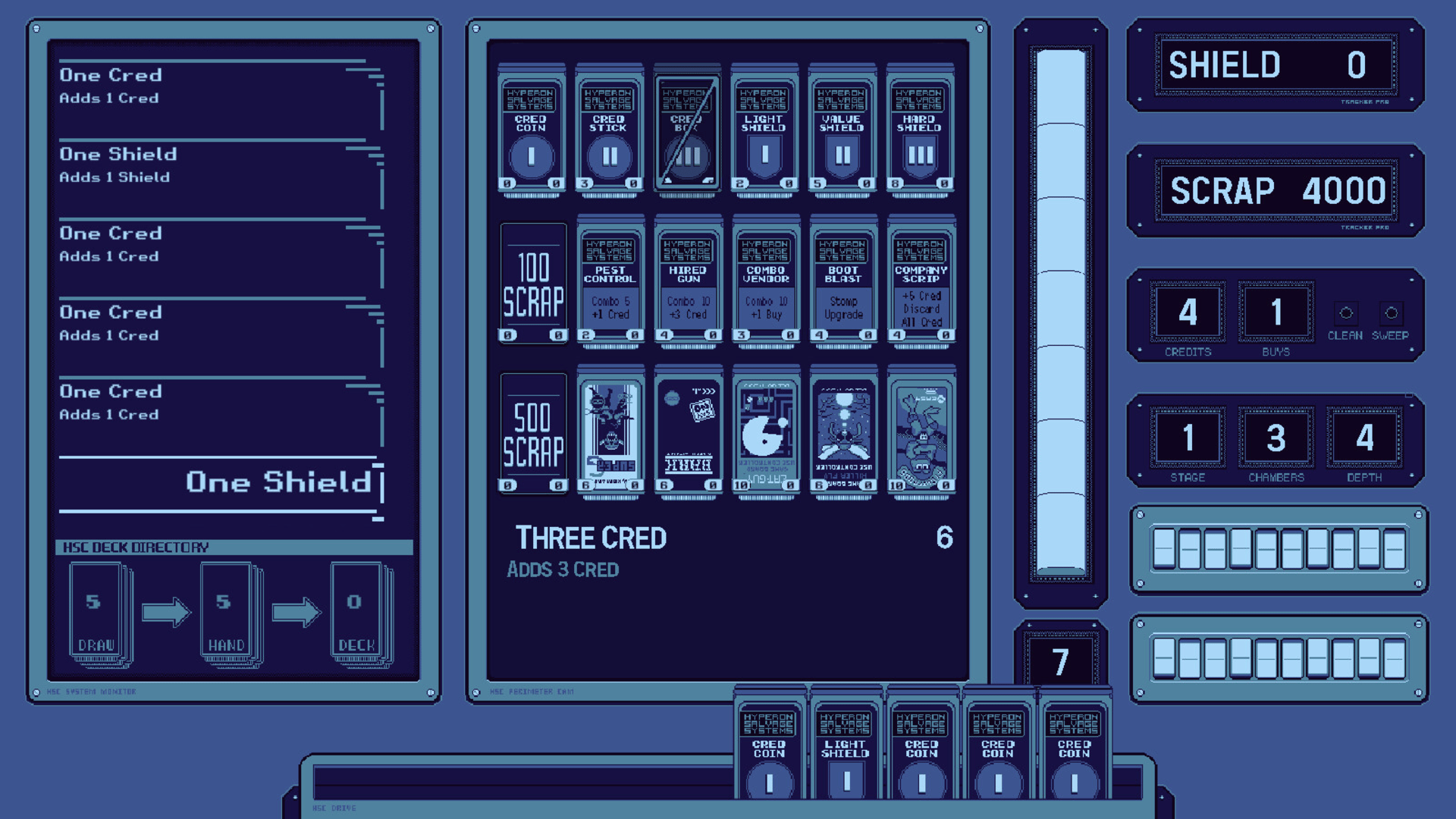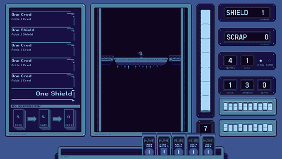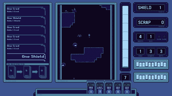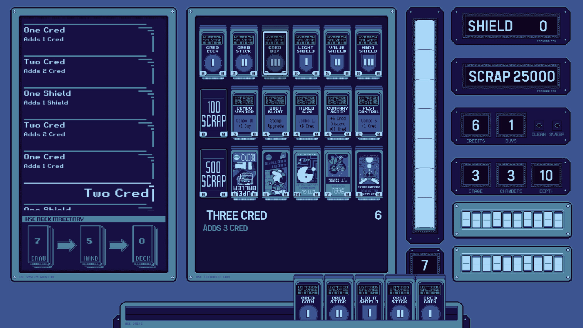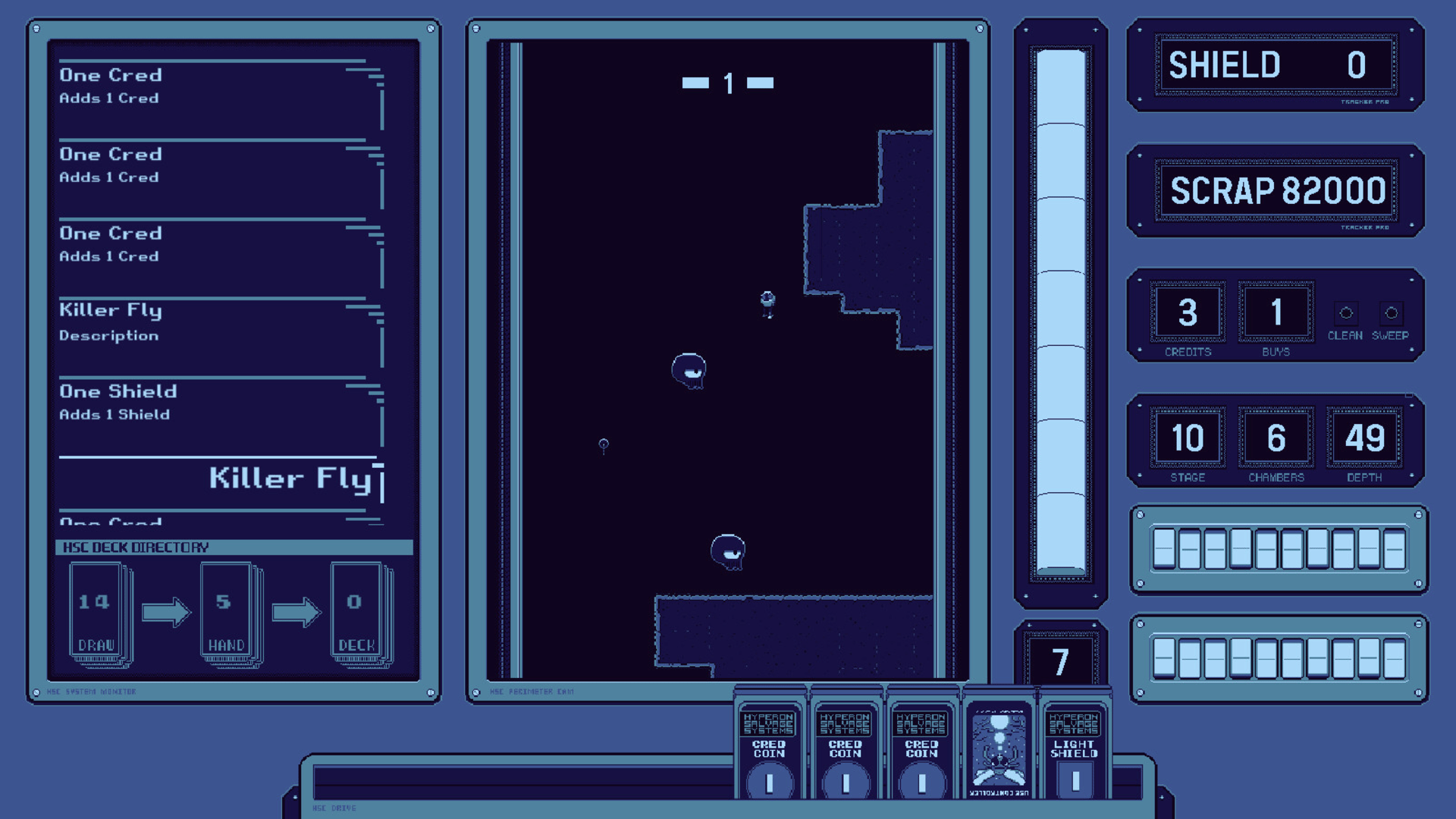 Discarded Empire is a run-based deckbuilding game where each player turn is resolved by plummeting through a deadly 2D stage in a Sweeper mech with bottom mounted cannons to clear your path and slow your decent.