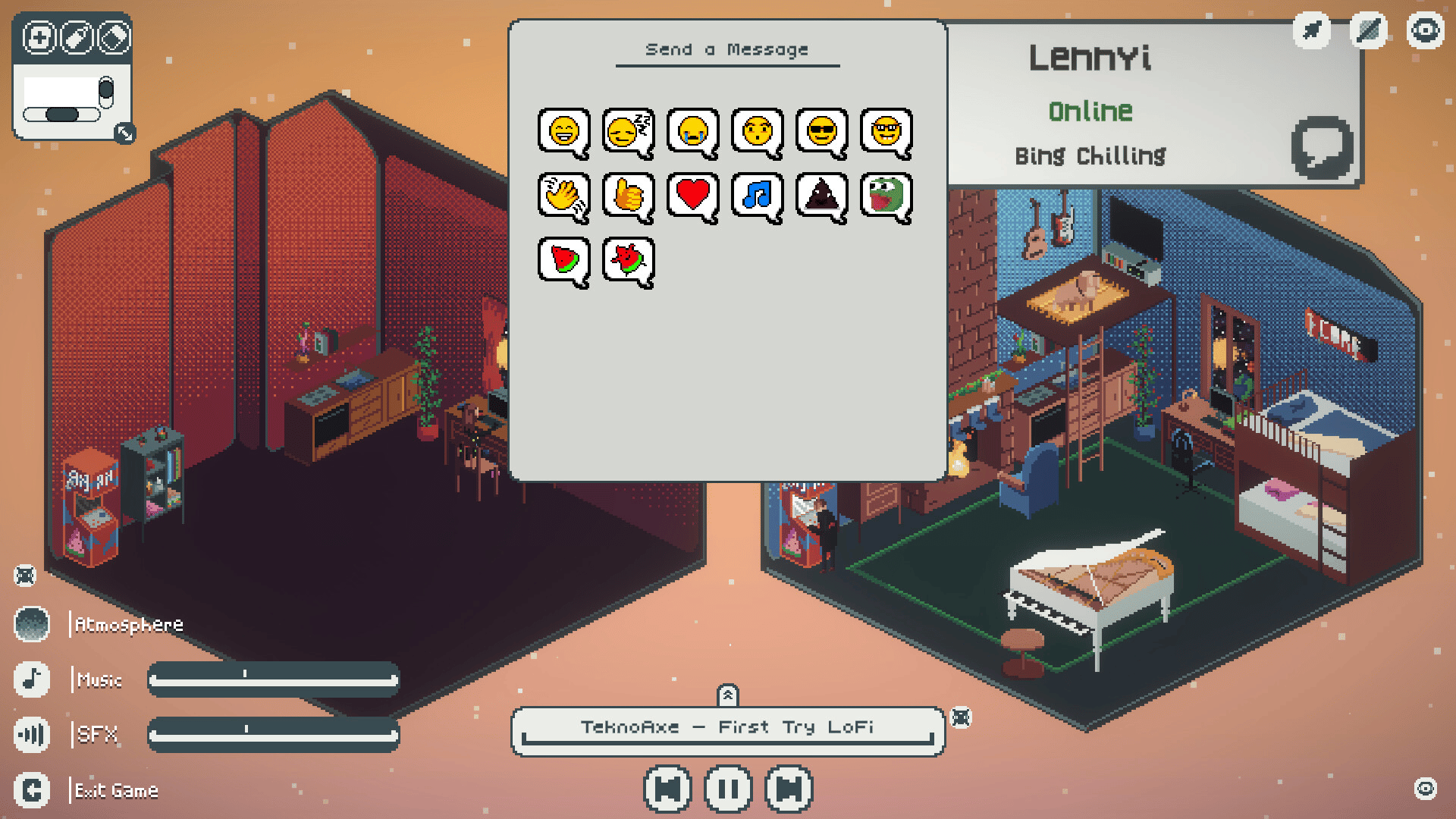 CottageVille is a cozy idling game, where you can design your very own cottage and do various activities (such as planning, listening to music, etc.) on your own, and together with your friends!