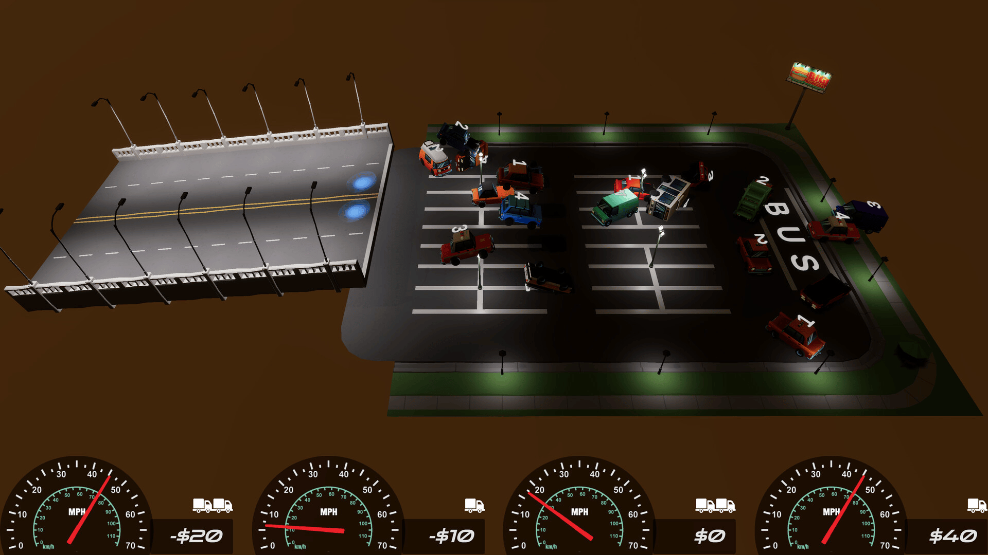 A physics-based parking pileup for up to four players. Smash other players' cars out of the way while placing your own cars perfectly - all without any brakes. A delightfully silly party game that'll have you rolling!
