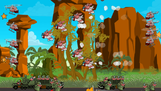 A Flash-based, chain reaction game in where players must fry as many pigs as possible. The pigs are on edge and will fire at the first sign of trouble, causing further chaos and combos. Once the player gets enough money and stars, they can purchase upgrades in the shop to grant the pigs more guns and explosives to keep combos going.