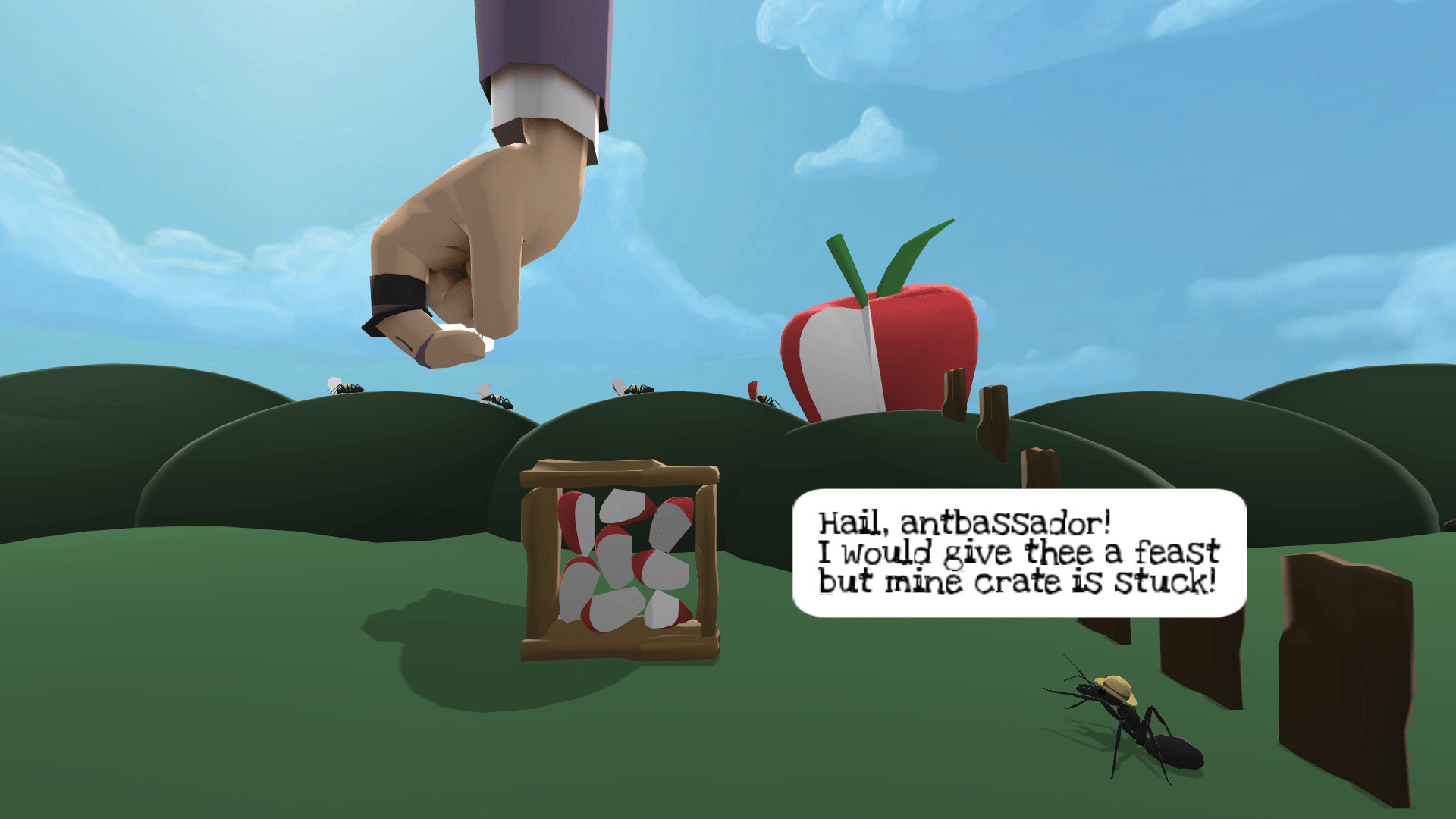Take control of The Antbassador, a giant human finger with a tophat, as he makes his way through a bustling ant colony. You must use your prodigious digit to help the citizens of Antopia without causing an international incident!