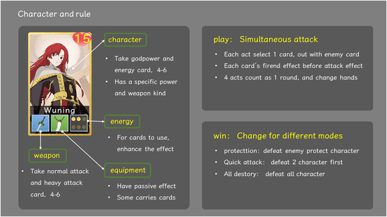 This is a synchronous turn-based card battle game where you build your card deck through the combination of characters, weapons and equipment to meet any challenge. welcome to my world:the land of godgrant.