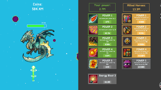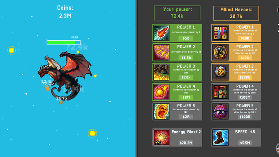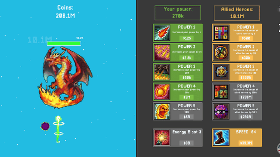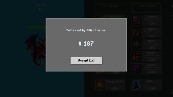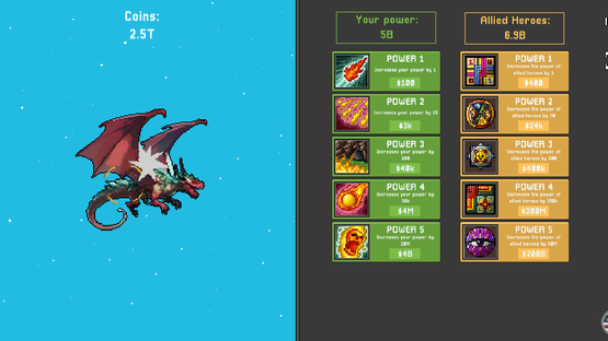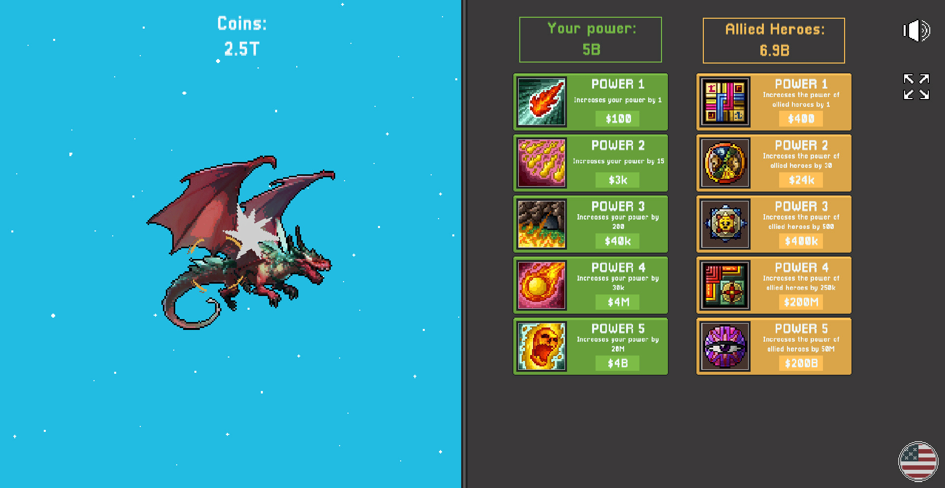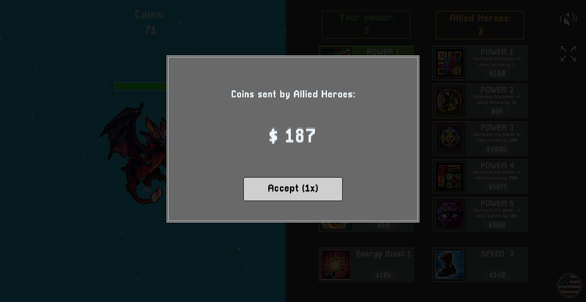 The land has been overrun by evil dragons It needs a leader to bring peace to the land. Start by clicking on the dragon to kill them, and collect coins. Spend that coin on your power and allied Heroes to get more damage. The more damage you deal, the more coins you will get.