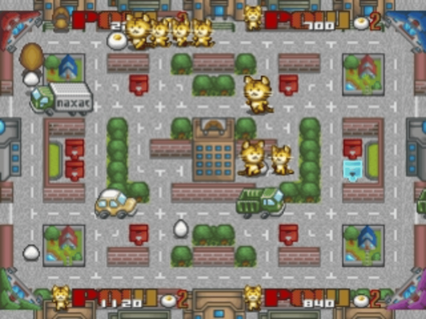 Motteke Tamago with Ganbare! Kamonohashi is a top-down Bomberman-style multiplayer arcade action game, and an enhanced port of the PC Engine game Motteke Tamago. This version includes the same arcade mode as the original release, and also adds a single-player story mode with multiple stages and new creatures to play as other than ducks, such as frogs and platypus.