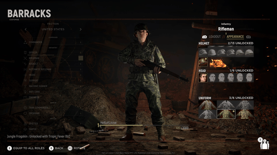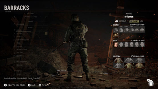 Pack Includes: US Jungle Frogskin Uniform for the following roles: Rifleman, Support, Medic, Sniper, Auto Rifleman, Heavy MG, Spotter, Assault, Engineer, Anti-Tank and Officer. US Jungle Frogskin Helmet for the following roles: Rifleman, Support, Medic, Sniper, Auto Rifleman, Heavy MG, Spotter, Assault, Engineer, Anti-Tank and Officer.