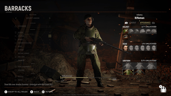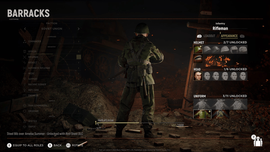 Pack Includes: Soviet Steel Bib Over Ameba Summer Uniform for the following roles: Rifleman, Support, Medic, Sniper, Auto Rifleman, Heavy MG, Spotter, Assault, Engineer, Anti-Tank and Officer. *Helmet not included