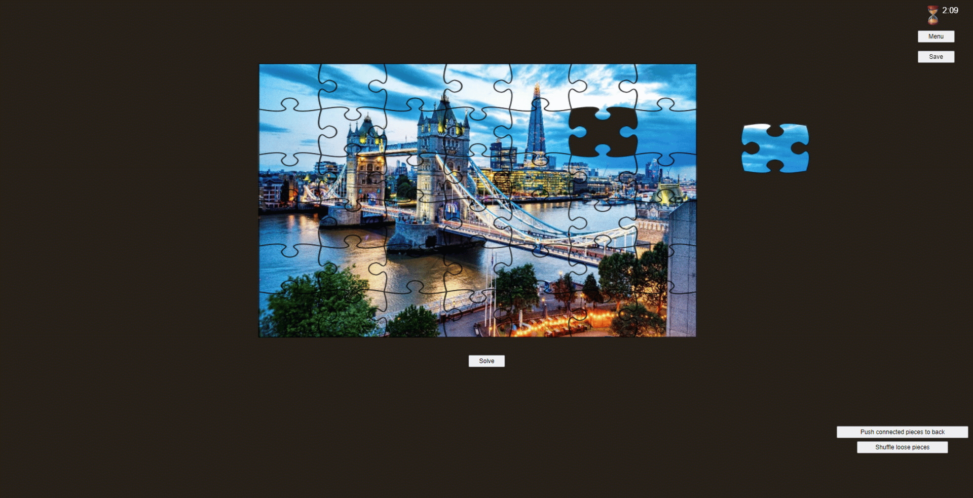 Do puzzles in a new puzzle way! Advanced puzzle layout and involving gameplay will help you to relax after a hard-working day. The player can choose to play with 30, 42, 117, or 285 pieces.