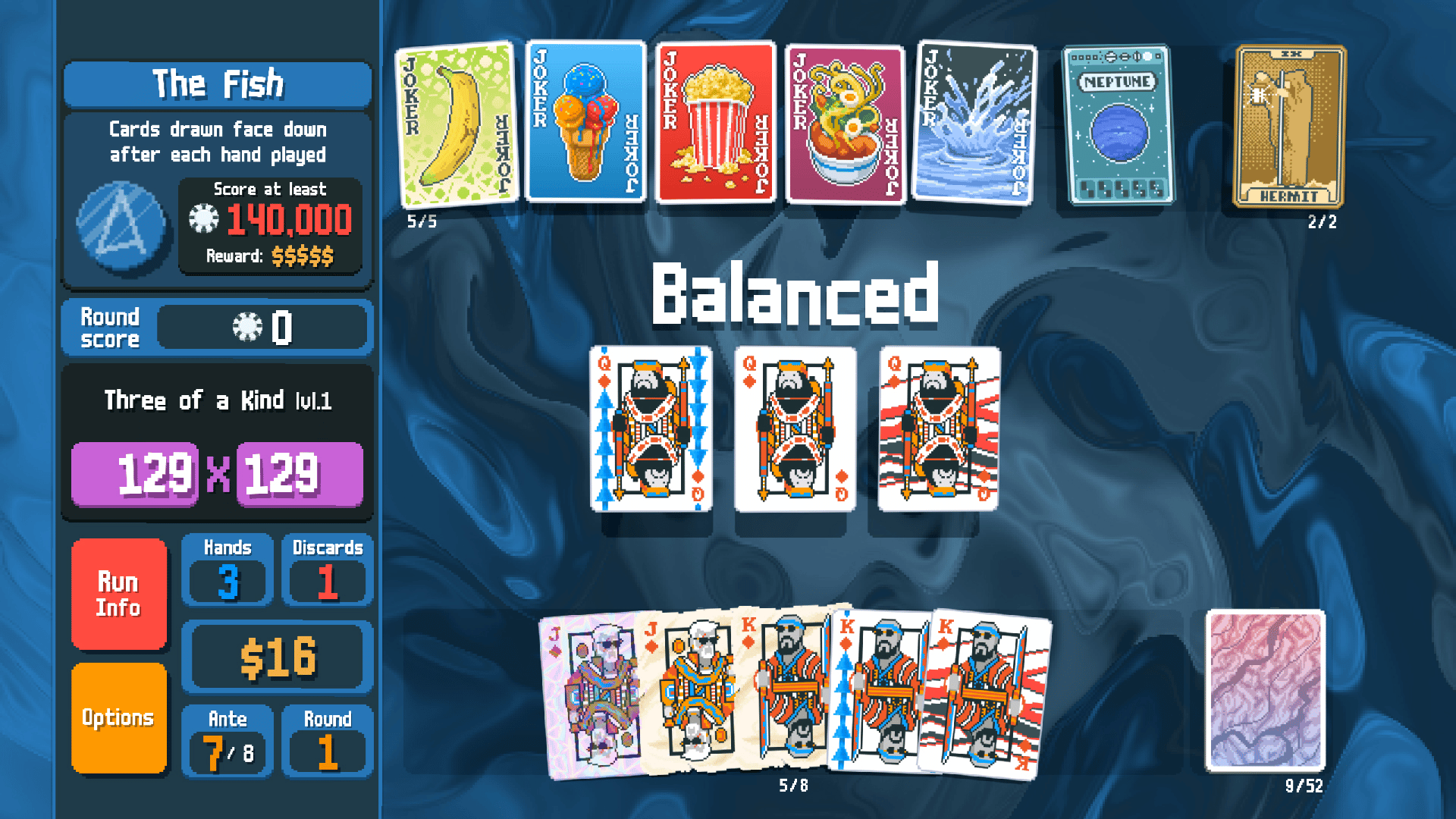 Balatro is a deck-building roguelite in which players construct poker hands to earn chips and overcome enemy blinds. The game features mechanics for enhancing a deck of playing cards, purchasing Jokers that modify hand effects, and discovering synergies to progress through increasingly challenging encounters.