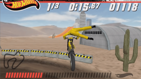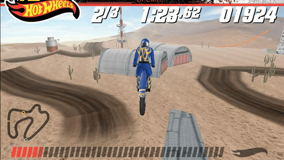 Team Hot Wheels: Moto X is an arcade racing game. The objective of the game is to score points in the race to unlock official Team Hot Wheels vehicles and car paint schemes. The points are earned for collecting pick-ups, smashing everything in the way, and winning the race. While racing a speed booster can be used. The player race against ghosts of the best times. The game features only one track, two camera views and allows to change the color of the driver and car parts. After scoring 100,000 points the player becomes a member of the Hot Wheels Team.