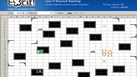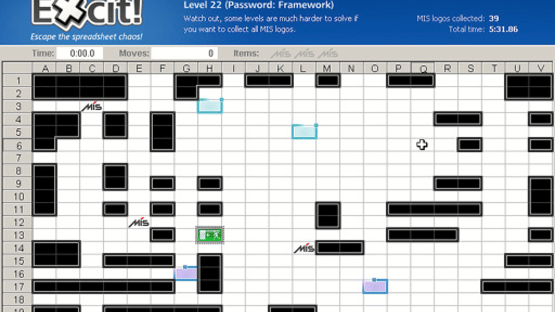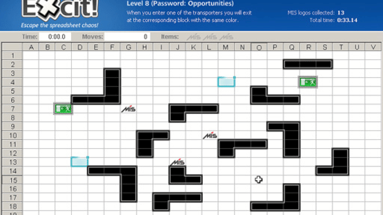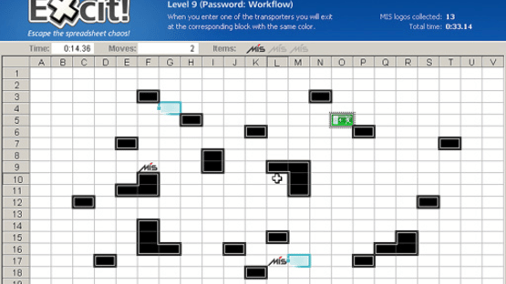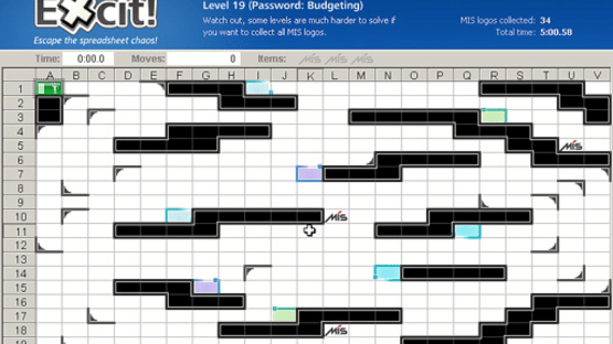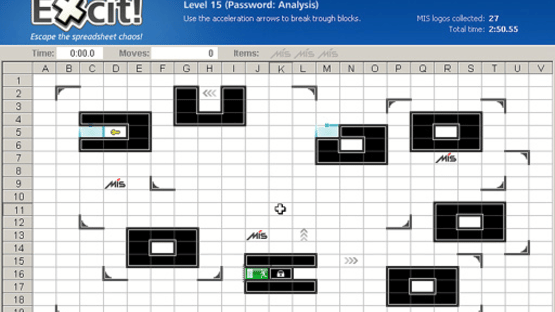 Excit is the best safe for workspace puzzle game ever. You're trapped in a spreadsheet and you need to escape the 30 levels using the cursor keys without sliding of the screen. Excit was created in the year 2005 as a viral marketing game for the German business software company MIS AG. In 2007, after the company dissolved, the game was released on the Internet for the first time.