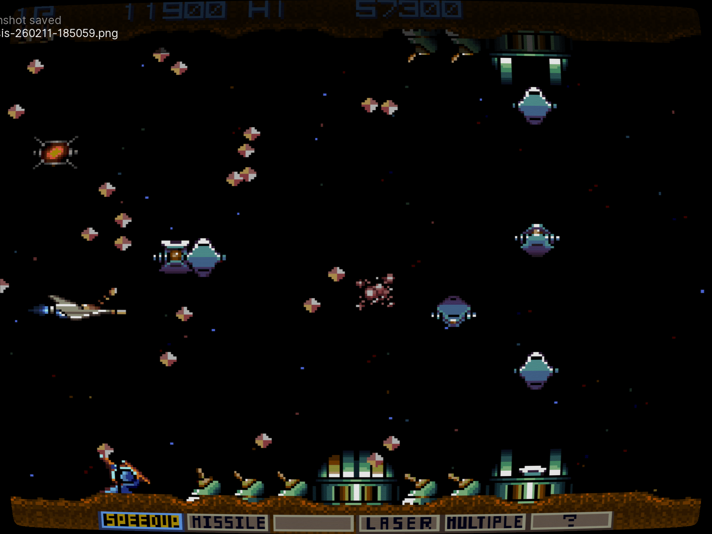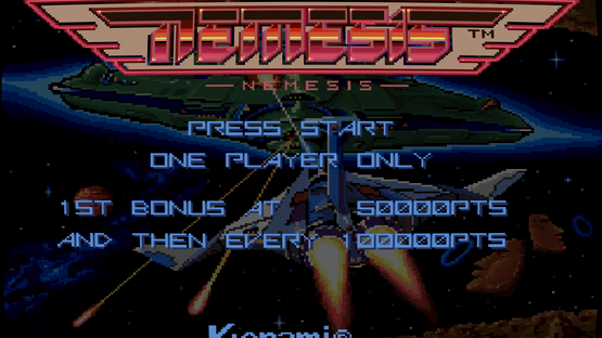 The North American version of Nemesis features a considerably increased difficulty compared to the Japanese and European version. To balance this, the game spawns a fleet of orange enemies when the player loses a life to provide as many power-up capsules as possible to recover as many upgrades as possible. Also the North American version presents a continue feature (but only for three times). The title screen was also updated, showing an in-game reproduction of the promotional artwork behind the logo.