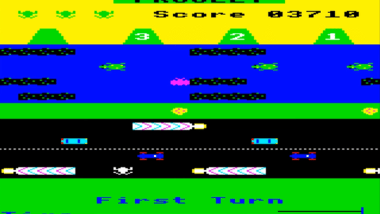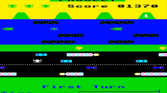 Froglet is a 1-player Frogger clone. The player controls a frog that moves in cardinal directions, trying to cross two busy highways with cars traveling in opposite directions. The roads are separated by a river with moving lily pads that the frog must hop across. There are six homes at the top of the screen that the player tries to position their frog into. The player starts with five lives, and the game restarts if all are used.