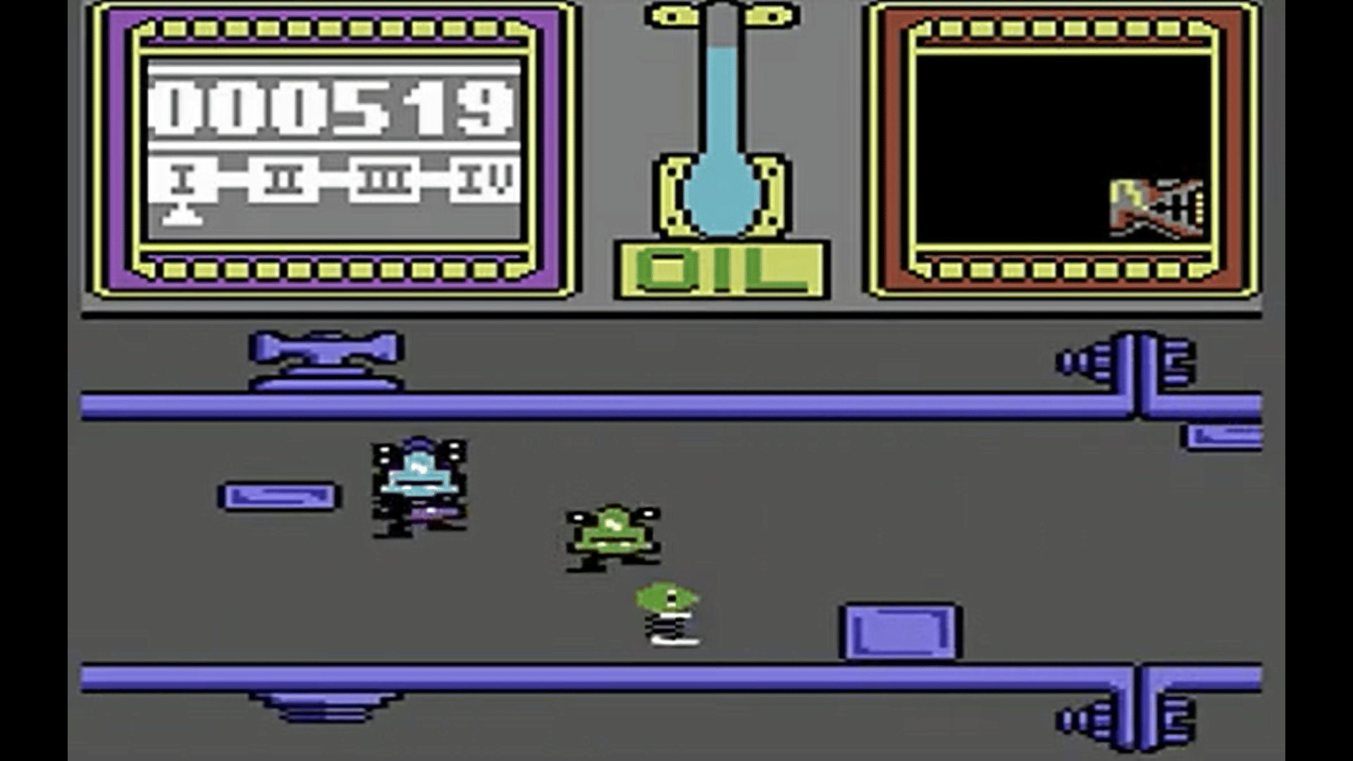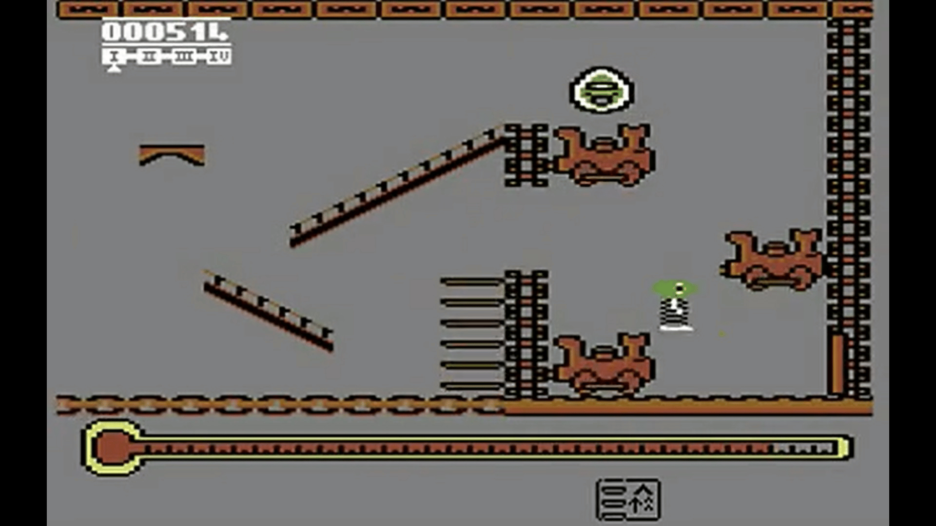 The evil Goblin has used his magical abilities to ensnare all the toys in the neighborhood to go into his underground lair. Thing bounces to the rescue, and resolves to retrieve them from his 4 storey underground lair. To do this he must collect 9 pieces of a jigsaw puzzle on each floor. Needless to say, Goblin has not made things easy - a myriad of traps await our intrepid hero. There are traps all over, some crucial areas are guarded by switches, and the last of these switches locks the level-ending lift.