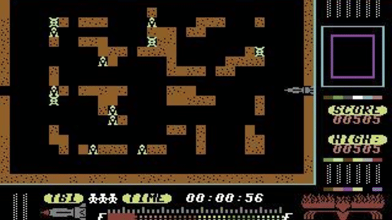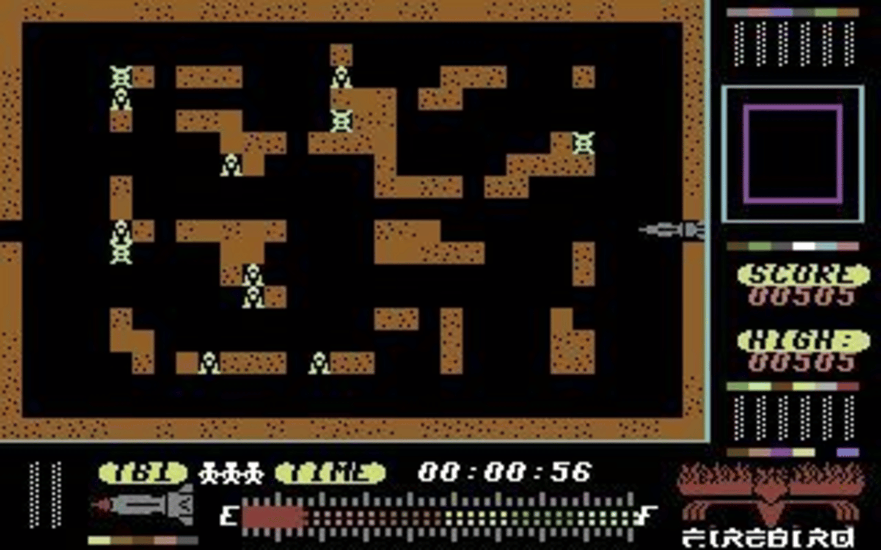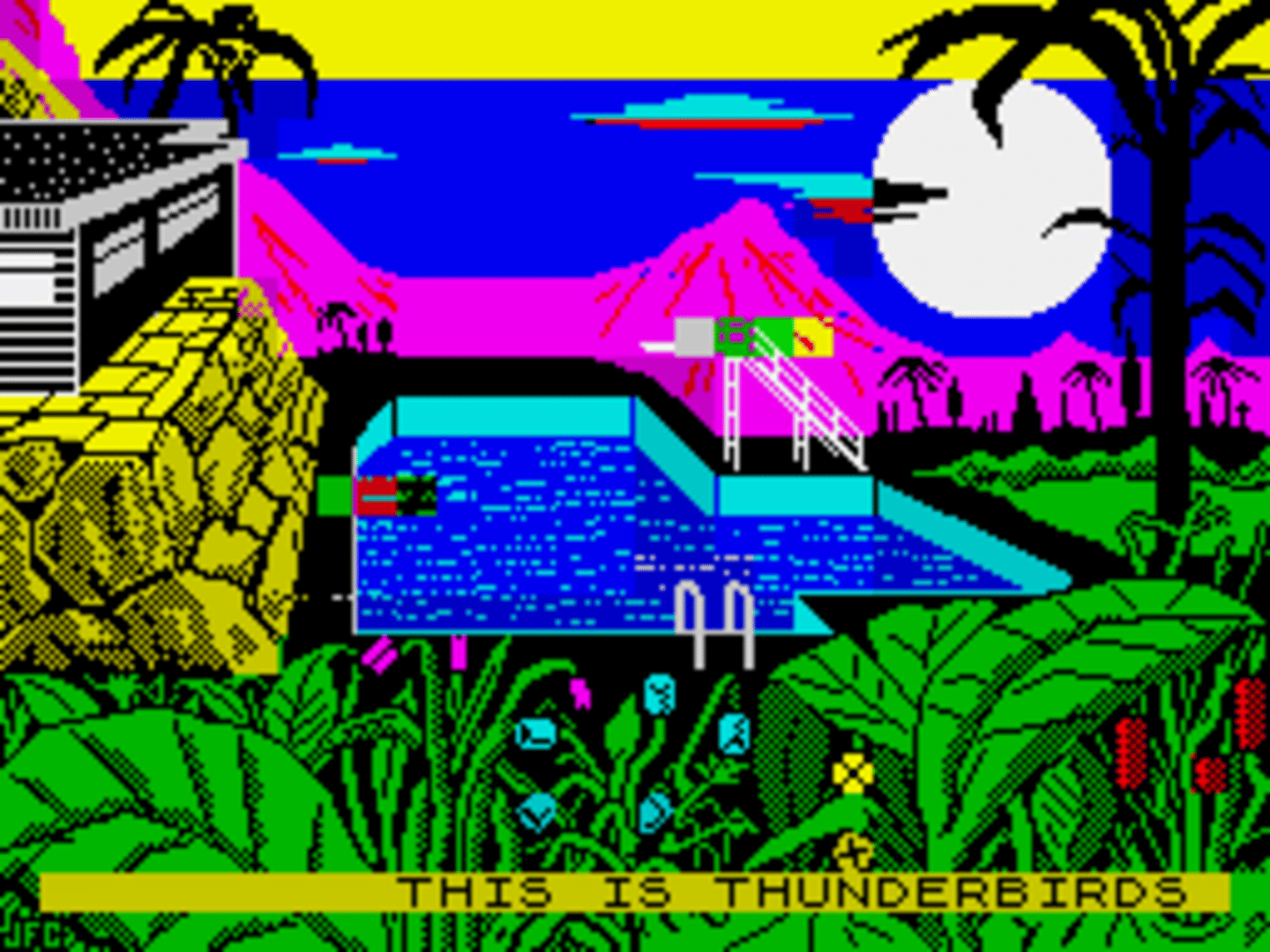 This is primarily a game of puzzles based on the tv show "Thunderbirds". It starts before lift off with the player selecting the equipment to be loaded into Thunderbird 2 which can only carry forty tons and every ton of equipment costs the player one hundred points. Should the Mole be taken? What about Thunderbird 4? Should extra fuel be carried? The loaded craft, when launched, arrives at the tomb and must fly through a series of mazes which makes up the tomb but it's not straight forward. The way is often blocked and must be cleared. Thunderbird 1 can move blue blocks out of the way, Thunderbird 2 can move green blocks and both can move red blocks and as an additional complication some passages are too narrow for Thunderbird 2 to pass through. Another feature of the puzzle is fuel management, flying uses up fuel but fortunately an earlier expedition did leave fuel dumps scattered around. There's treasure to be collected too. The game can be played on color or black & white monitors, the F7 key re-tones the colored blocks so the player can distinguish between them. It can be played either with the keyboard or with the joystick.