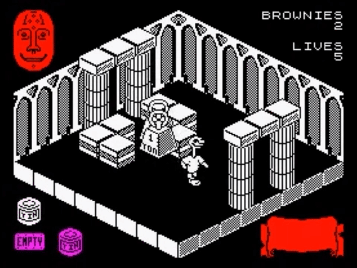 The Self-Willed Extreme Environment Volitional Organism, or Sweevo for short, is a goofy-looking and generally incompetent robot. His world is Knutz' Folly, and it comprises almost 200 isometric-viewed screens of danger and challenge, making for a game influenced by Knightlore, although it takes a less serious approach to the genre. Sweevo can enter the world through four different vertical levels, and must use lifts and holes to cross through these to solve many puzzles. You will meet some decidedly weird inhabitants. Most dangerous are the Dictators and Minxes - contact with these will drain Sweevo's energy, as will contact with water (he's a robot, remember). Energy can be recharged by scaring the Geese and picking up the tokens this reveals. The main score is a percentage, although several other totals are kept - most unusually 'Brownie Points', through contact with the brownies.