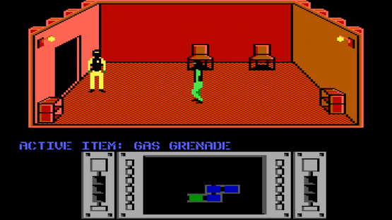 Infiltrator is a combination of first-person helicopter simulator and isometric third-person espionage action. You, as Johnny McGibbitts, ace pilot and neurosurgeon, were given a mission against the "Mad Leader". You have to fly in a helicopter behind enemy lines and make a diversion there. You can fool the choppers into believing that you are one of the bad guys, and also you can show false documents to guards in the enemy camp. If they aren't fooled then you can use a spray of sleeping gas or even a grenade. There are many houses in the camp, which have many rooms containing useful items, but you won't be able to get them all because of the time limit for the operation.