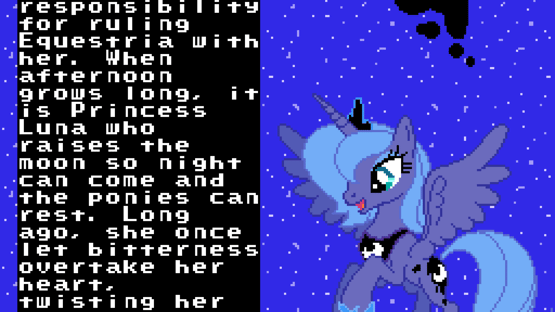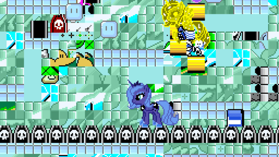 My Little Pony: Super Luna Game DX is a Super Mario World rom hack made for the 2022 Pony Dev Jam on the MLP Forums. The game is based on the Luna Game creepypasta series of games and heavily features the character Princess Luna.