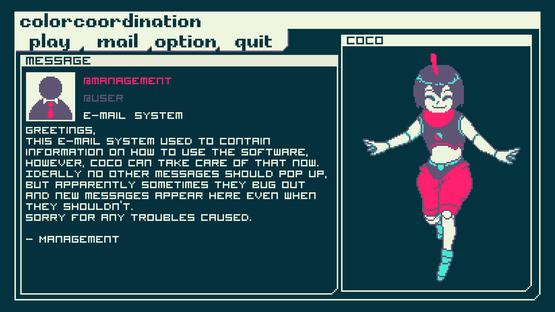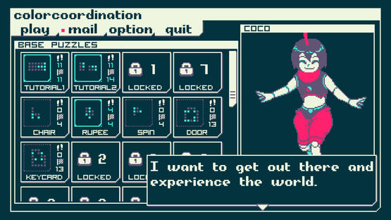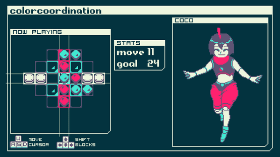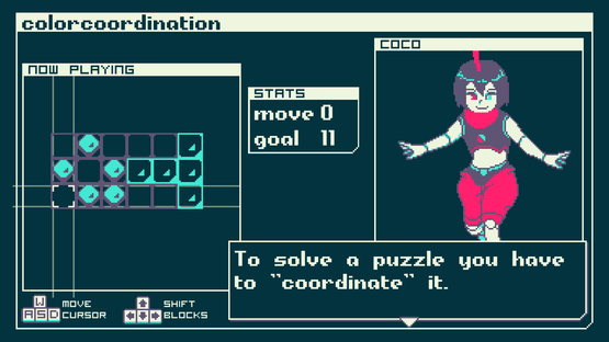 ColorCoordination is a puzzle game where you match colored blocks and spaces by moving them in unison. Explore deep, philosophical topics with your AI Assistant "CoCo" and discover more about its purpose - all while solving a myriad of colorful brainteasers!