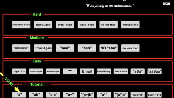 In this game, we will play with the simplest automaton model, Finite State Automaton, and use it to cope with 30 challenges.