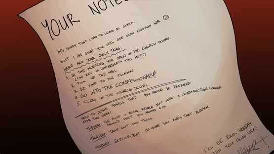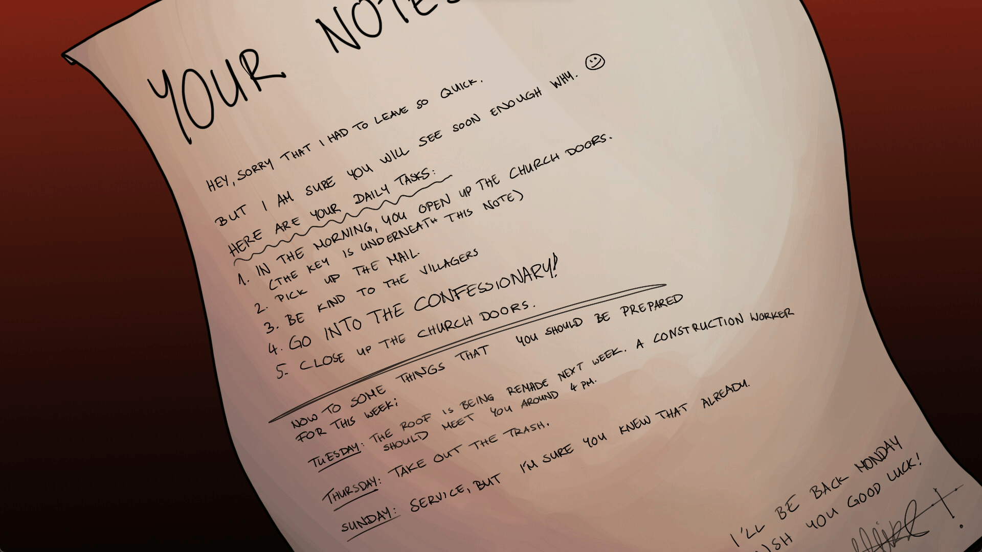 Welcome to [REDACTED], our lovely village. Get acquainted with our community, pray for a bit, and let's go. Meet our newly acquired priest and get rid of your sins as quickly as possible. PS: We advise you not to stay outside buildings after 9:00 p.m.