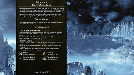 A mod that adds the Dark Souls civilization with its Leader Firekeeper. Playing as her gives you: - Unique district (Firelink Shrine) - Unique unite (Undead & Mimic) - Unique city projects (Weapon Schematics) - Changes how religion is spread for everyone on the match (Soul Gathering) - And much more!