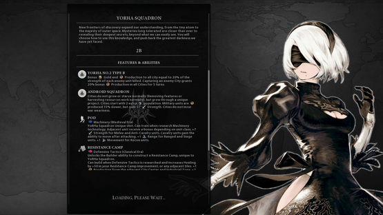 A mod that adds 2 leaders, alongside the Yorha Squadron civilization. 2B as a leader gains production based on the strength of enemies killed, and gains a bonus yield % too all cities when capturing one. White gains a bonus production per trade route, increasing the output per era, and gaining additional gold per city that it passes. The civilization bonus are as follows: - Unique tile improvement (Resistance Camp) - Unique support unit (Pod) - Unique city projects (Android Production) - Adds music from the Nier franchise to the game - And much more!