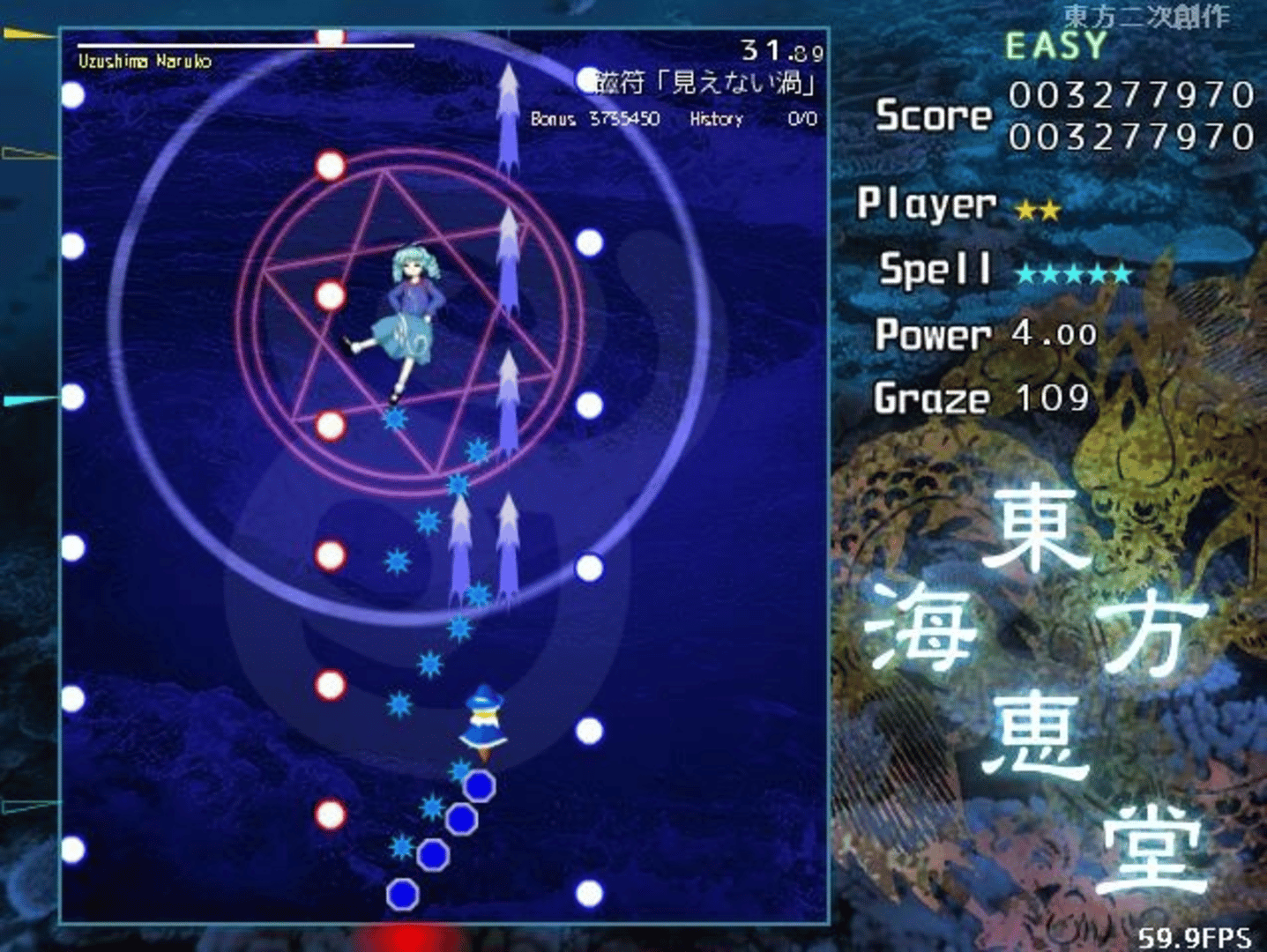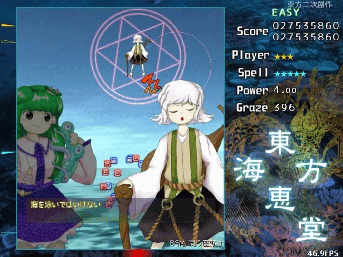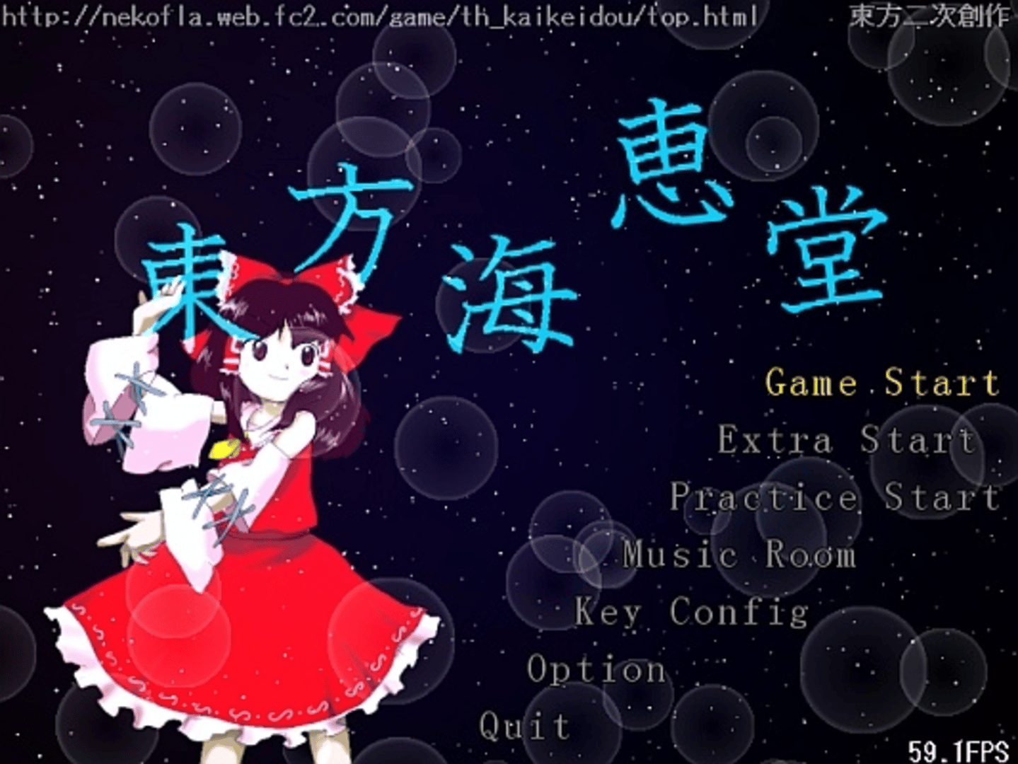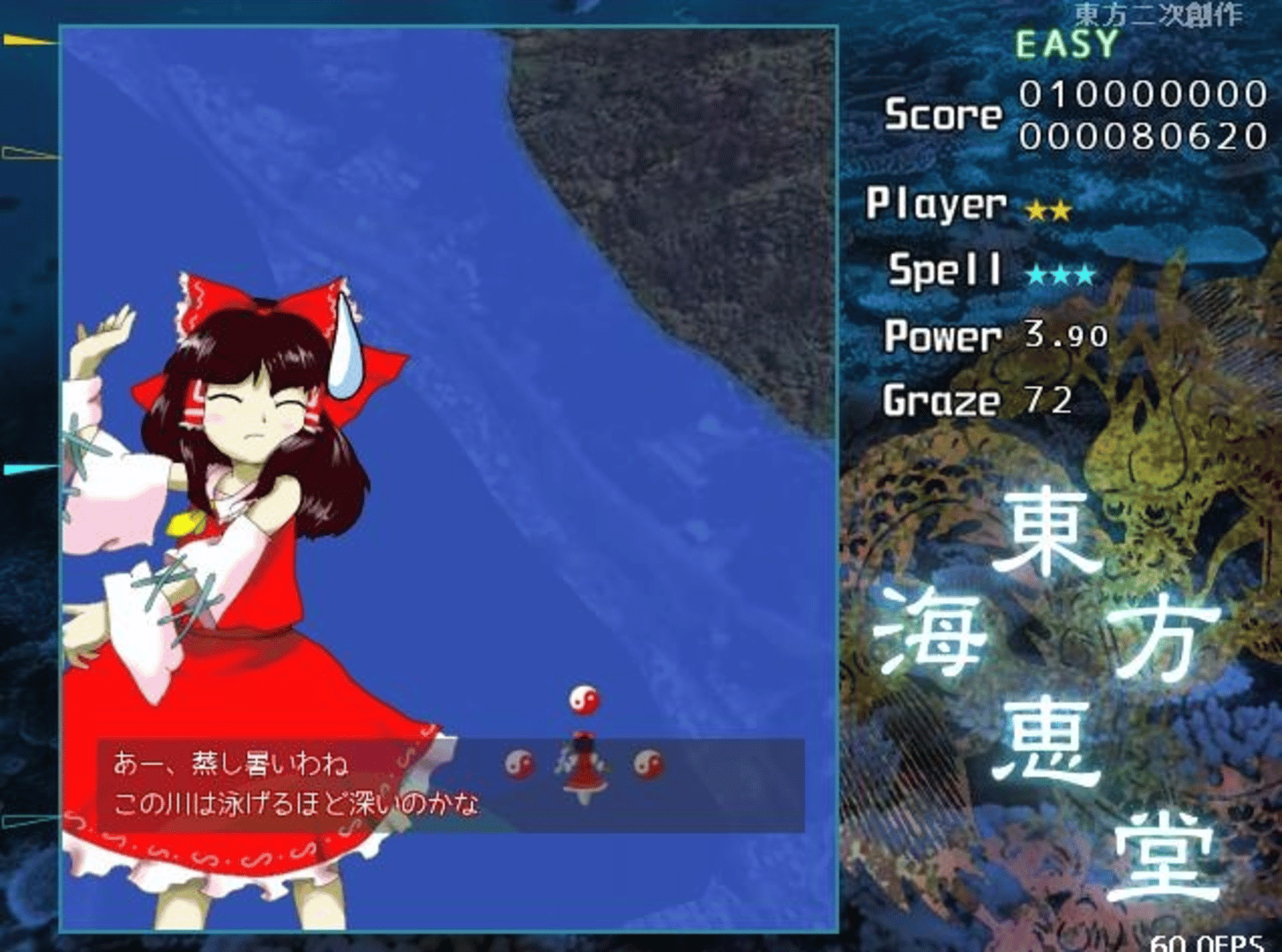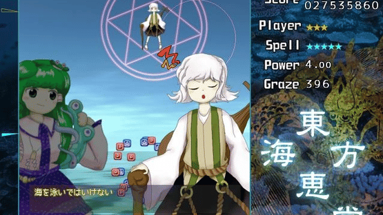 Touhou Kaikeidou ~ Marine Benefit is a Touhou Project fan game made by Primary-Color Space. It has an oceanic atmosphere reflecting some false predictions that Ten Desires would have an underwater theme. Marine Benefit features three playable characters to choose from, each of which has three shot types to choose from. The game features 'Oxygen' and 'Hydrogen' items which, when enough are collected, grant extra lives and bombs respectively. Hydrogen items are also important in that the marker which indicates how many you have also acts as the game's point of collection. Grazing is also important as it increases Oxygen.