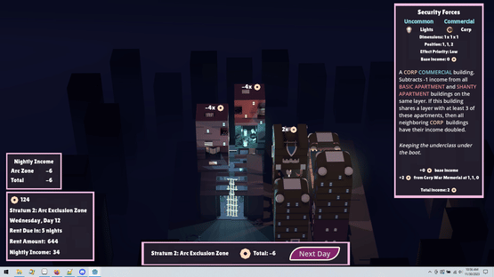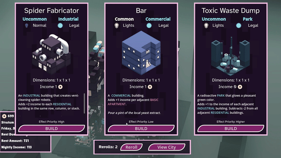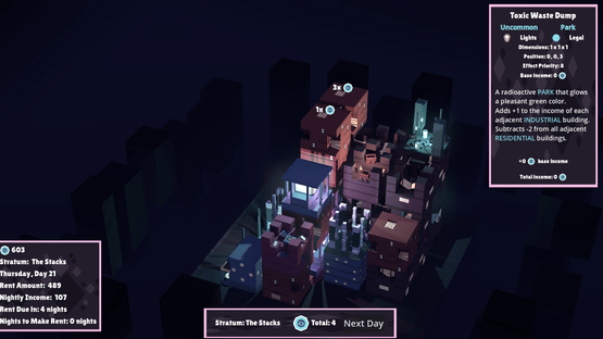 Neongarten is a minimalist cyberpunk city builder where you build from the ground up! Find synergies between buildings to maximize taxes, pit mega-corps against illegal hackers, and place toxic waste dumps over coffee shops. Chill out to lo-fi tunes while your city block grows one cube at a time.